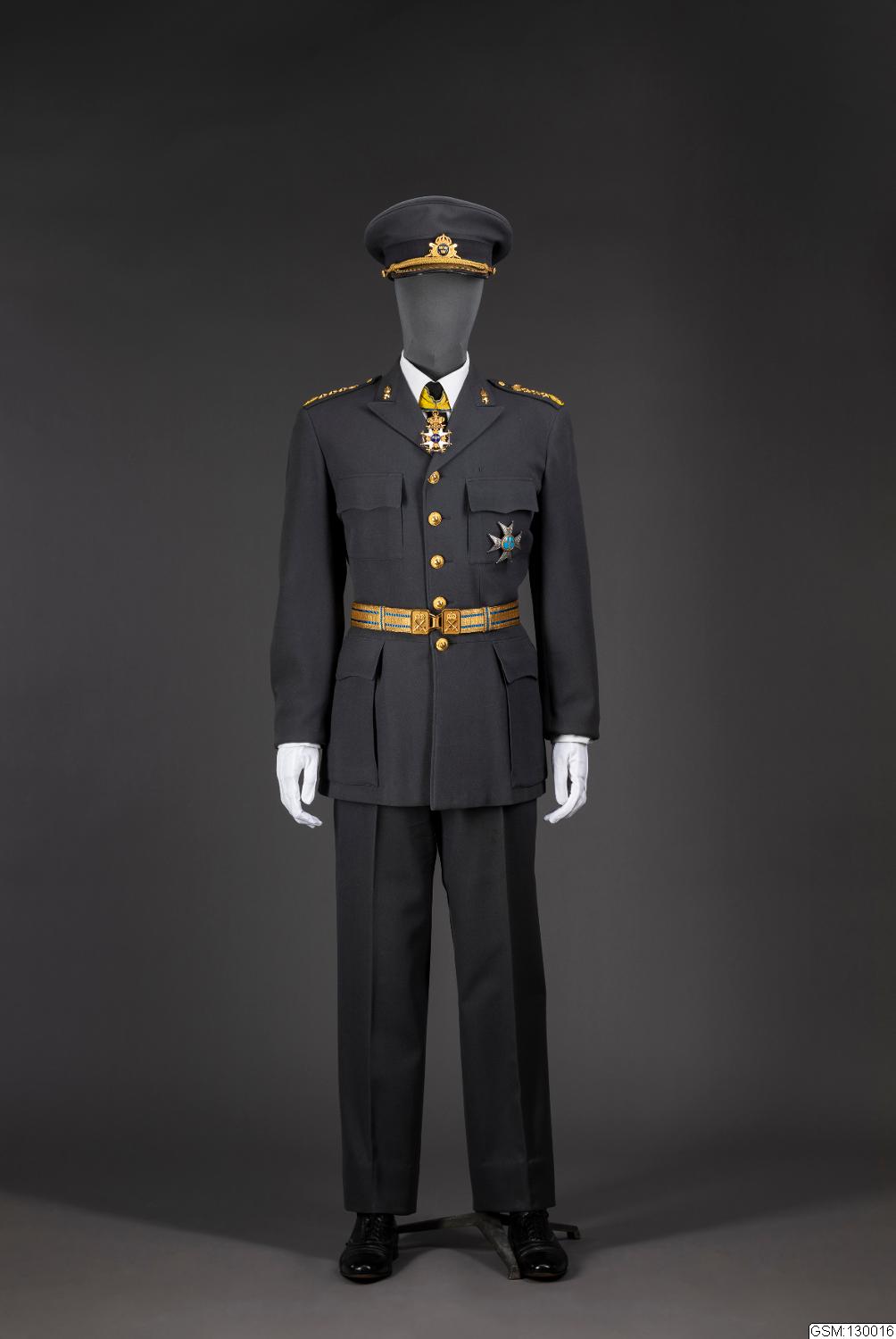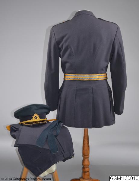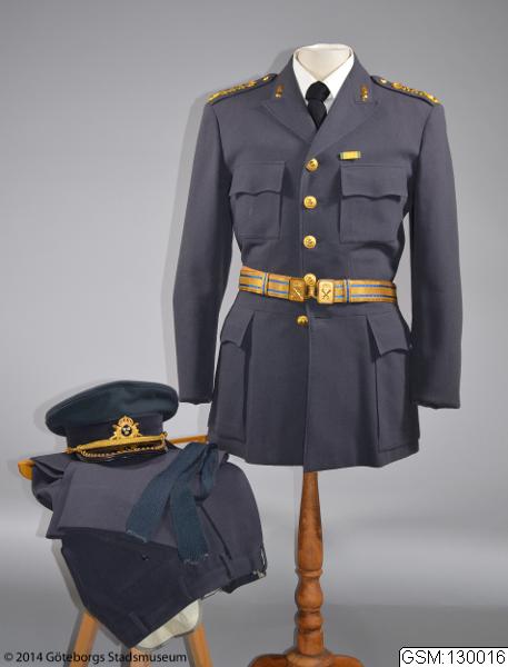 uniform, modell 1960, bestående av stålgrå vapenrock, byxor, vit skjorta, paradskärp, svart sidenslips, grå stickad vardagsslips, skärmmössa. Buren av den siste regementschefen för Kungl. Göta Artilleriregemente, A2, i Göteborg Överste Nils Holmstedt, KSO1 kl mm. Regementet nedlades år 1962.