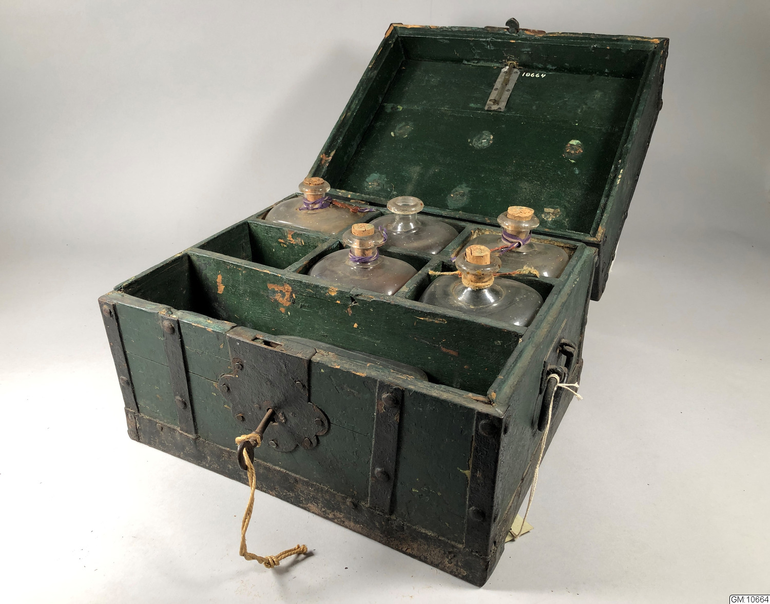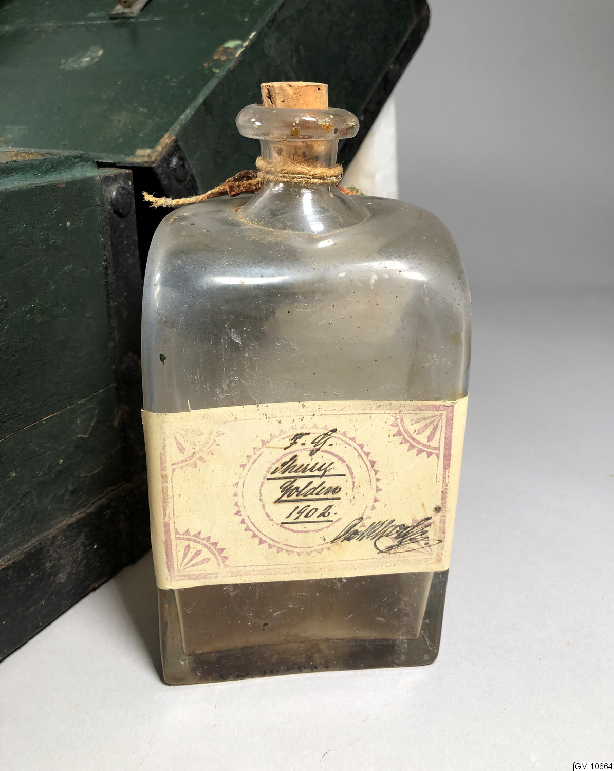 - Spritschatull innehållande sex st glasflaskor, vätskan är avdunstad.
