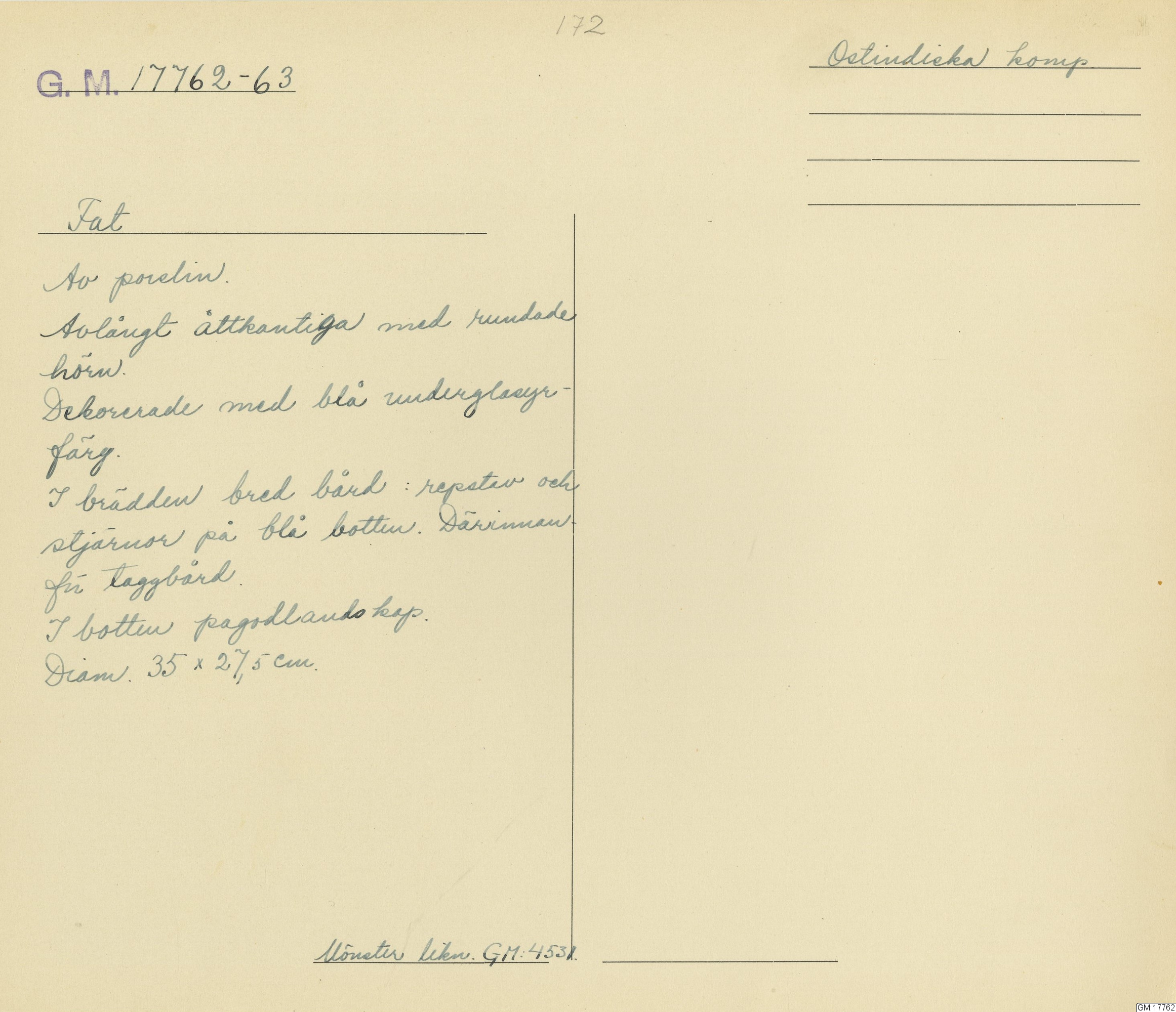 GM katalogkort 172. 18E. Porslin Ostindiskt 2. Fat, assietter, bålar