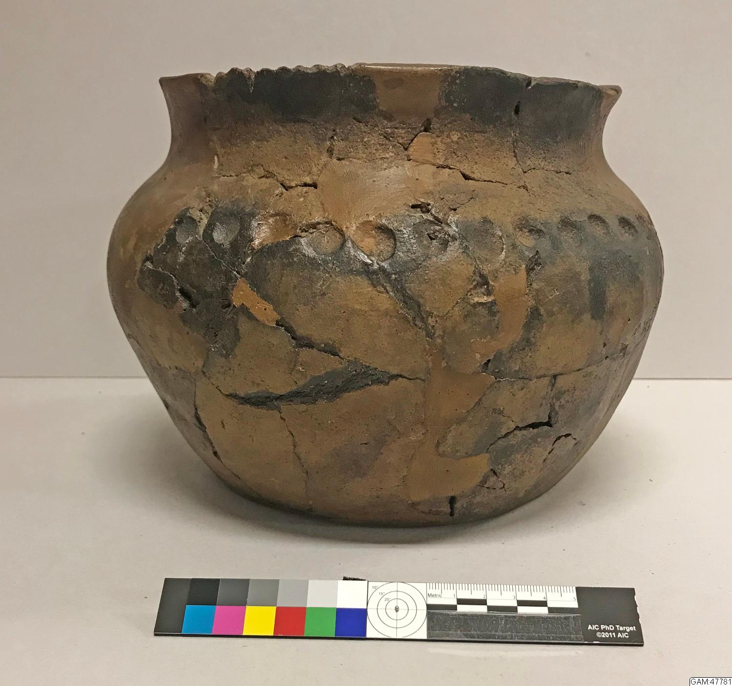 - Ett 40-tal keramikskärvor av ett stort kärl ornerat. Fingerintryck.