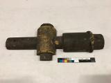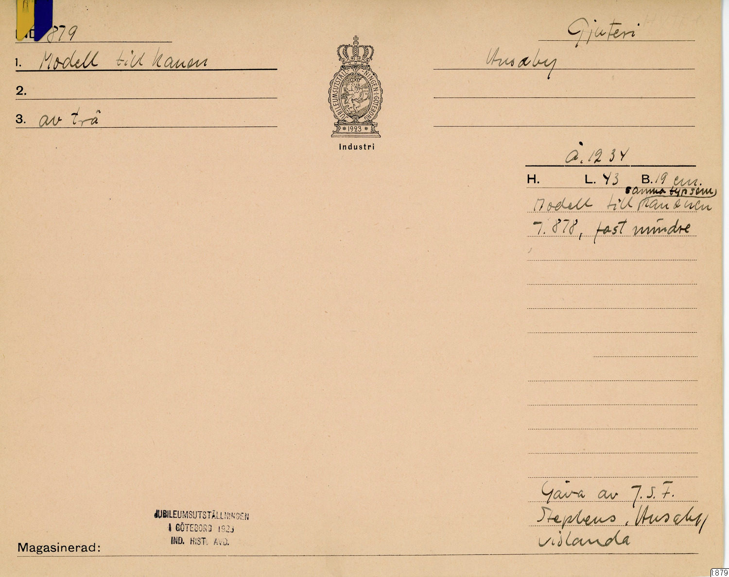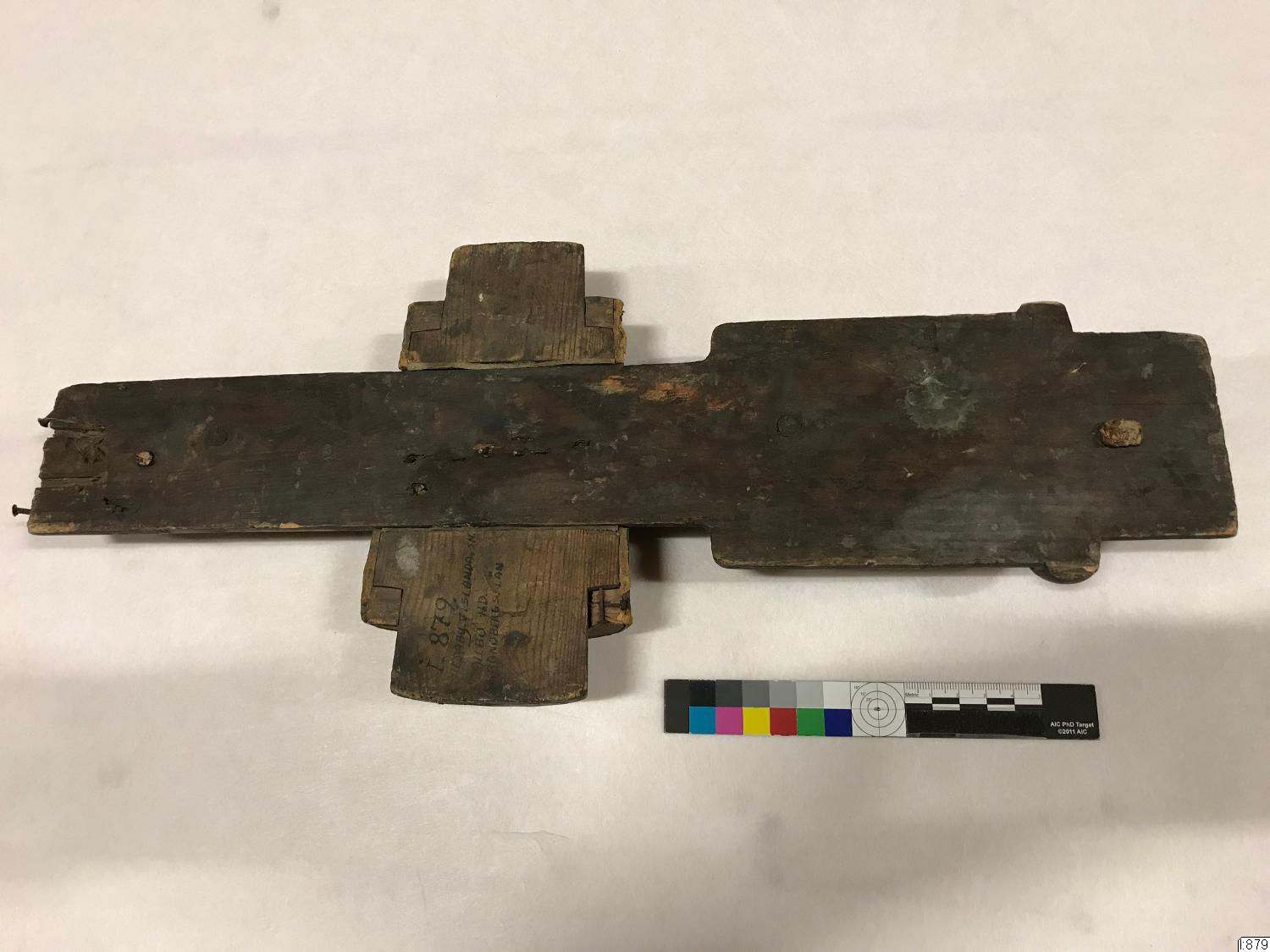 - Träform med platt undersida och rundad ovansida. Tre krokiga järnspikar sitter i ena änden. Vid inventerienumret står: "Husaby, Visland sn, Albo hd, Kronobergs län." Egentligen ska det stå Huseby, eftersom Huseby bruk ligger i Vislanda socken.