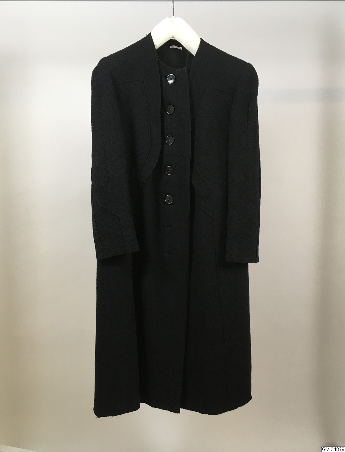 Damkappa av svart mönstrad yllebouclé, knäppt framtill med 7 st knappar. Arbetade partier från axlarna ned över bysten samt baktill och nedtill på ärmarna. Svart konstsilkefoder. Ficka på vänster insida i fodret.