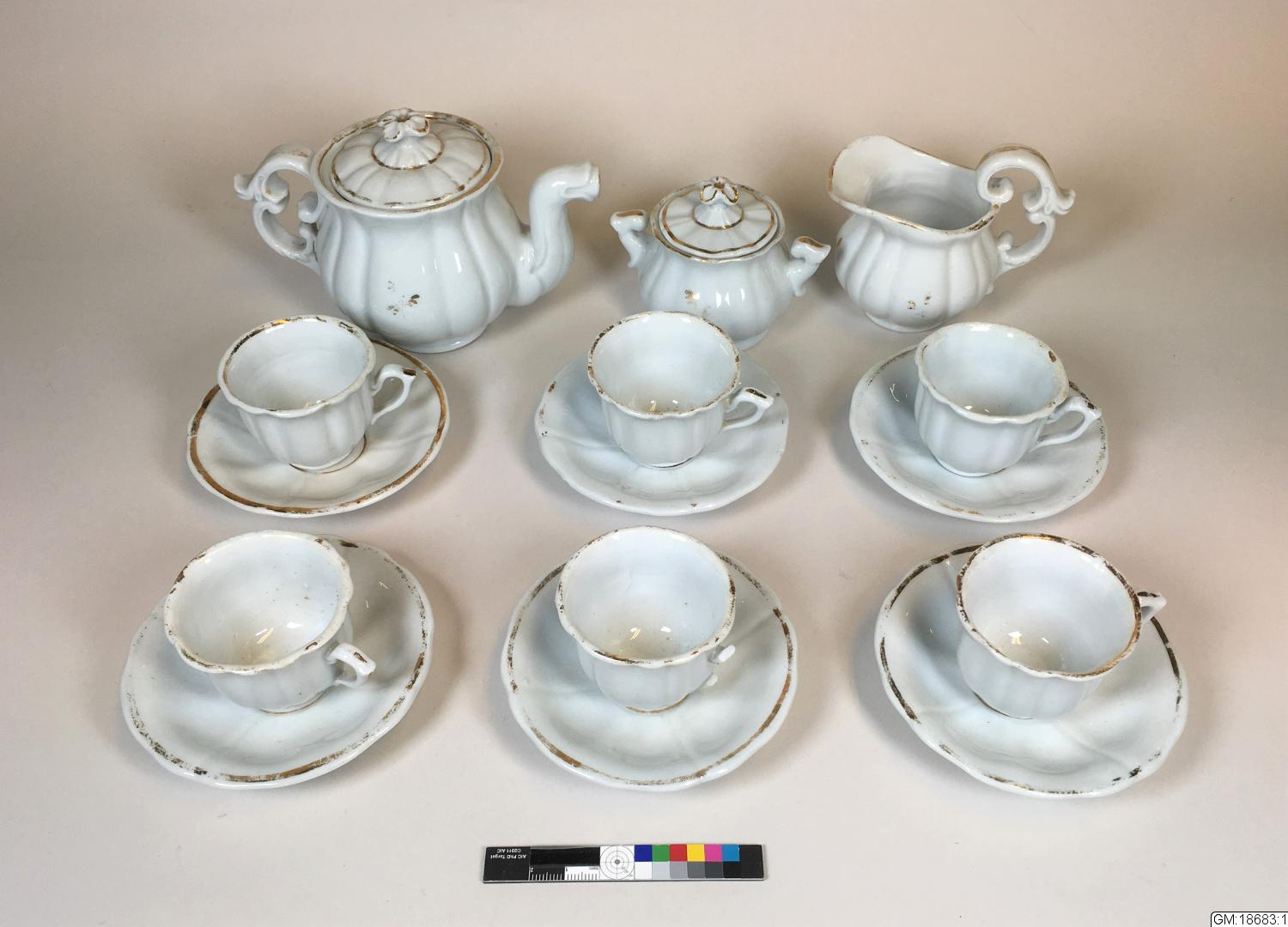 Servis i porslin för dockskåp bestående av 1. Thekanna m. lock, 2. sockerskål m. lock, 3. gräddkanna, 4. Koppar, 6st, 5. Thefat, 6st.