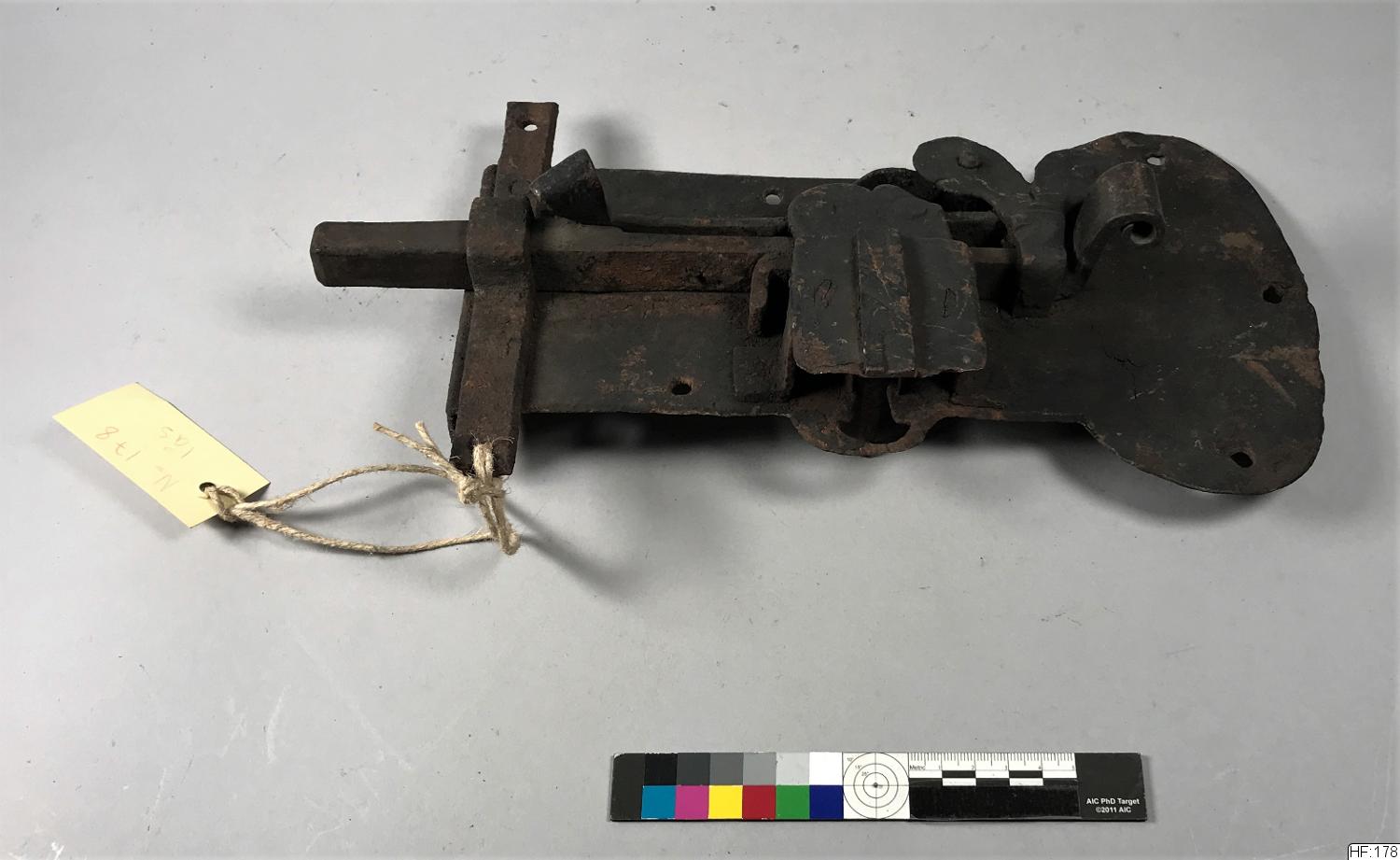 handsmitt portlås eller dörrlås. Obekant tillverkare. Funnen vid restaurerande av Lefflerska huset vid Östra Hamngatan