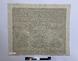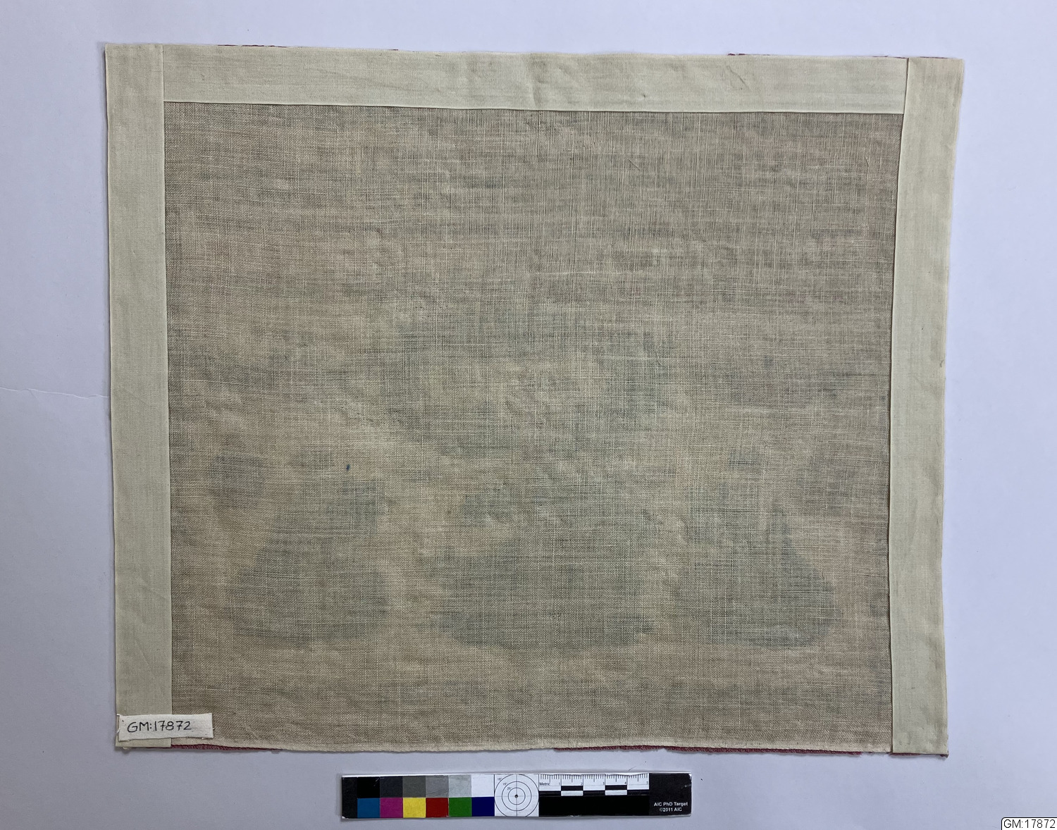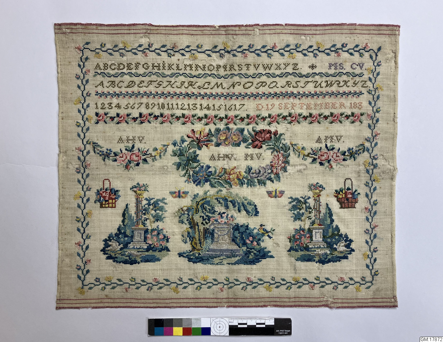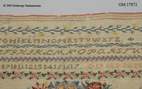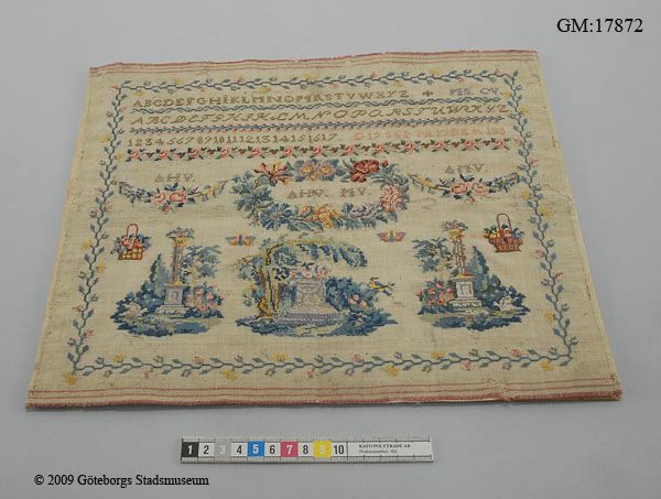 - Märkduk med korsstygnsbroderi på gles ofärgad linneväv med vävd randning i rött i dukens övre och nedre kant. Mångfärgat broderi i silke med blomrankor, slingor, piedestaler med blommor samt bokstavs och siffer rader. Broderad med versaler A-Z i rak och kursiv stil samt siffror 1-17. Dessutom finns initialer MS, CV, AHV, MV, AMV samt datering " D 19 SEPTEMBER 183 " (den sista siffran är borta men av en färgskillnad på linneduken kan man se att det stått 1831).