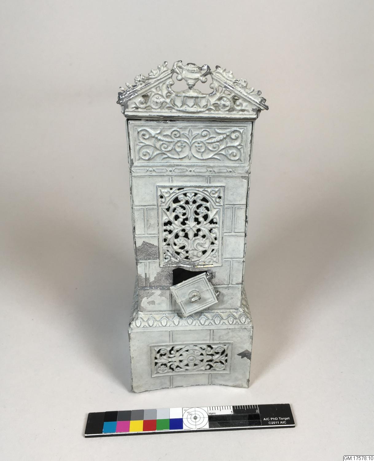 - kakelugn för dockskåp i vitmålat tenn.