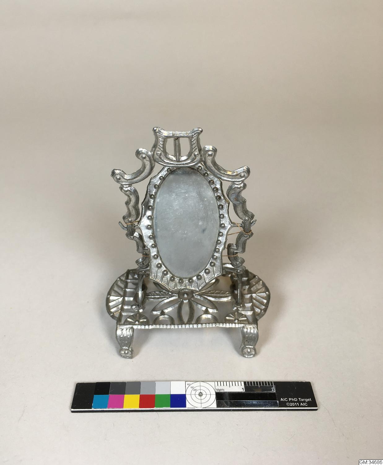 Liten oval ställbar (otydligt) spegel inom ram på underrede med fyra fötter. Genombrutet ornamenterat arbete.
