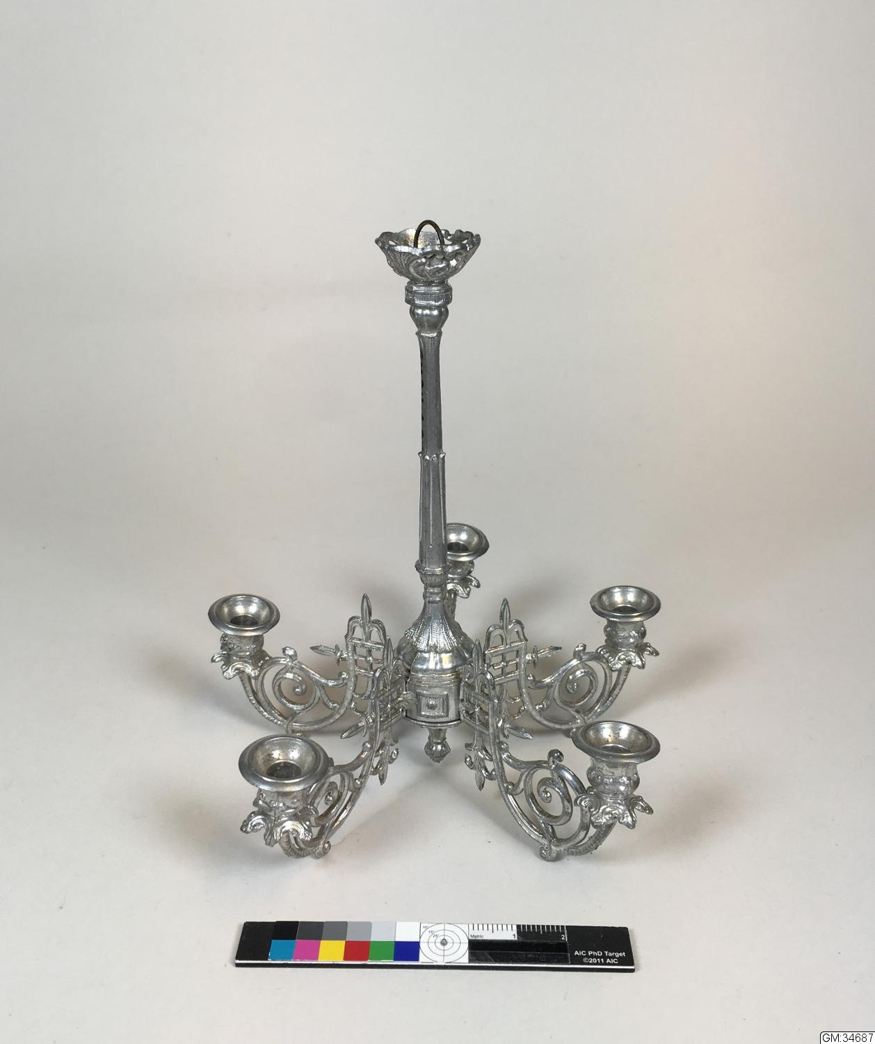 Leksak för dockskåp. 5-armad ljuskrona för små stearinljus i gjutet tenn. Rikt ornamenterad med rocailler, franska liljor etc.