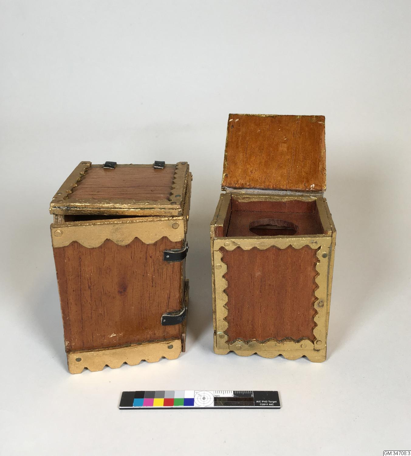 - Större kommod av brunt cederträ med dörr och uppfällbart lock. Guldmålade vågformiga lister. Hemmagjorda.