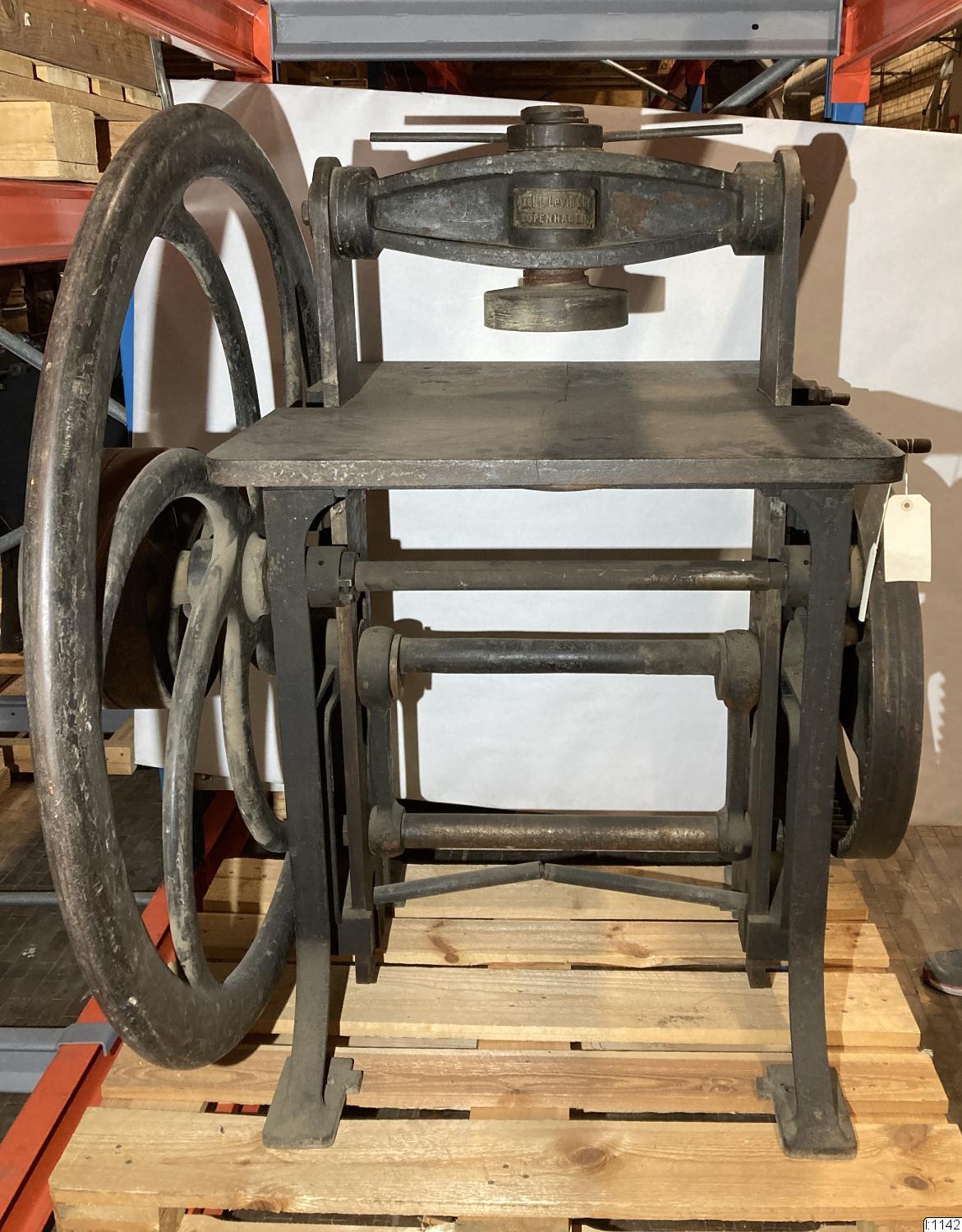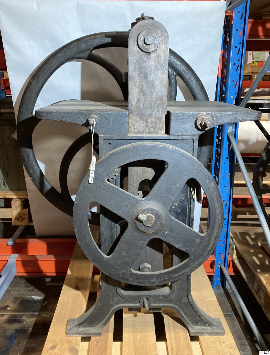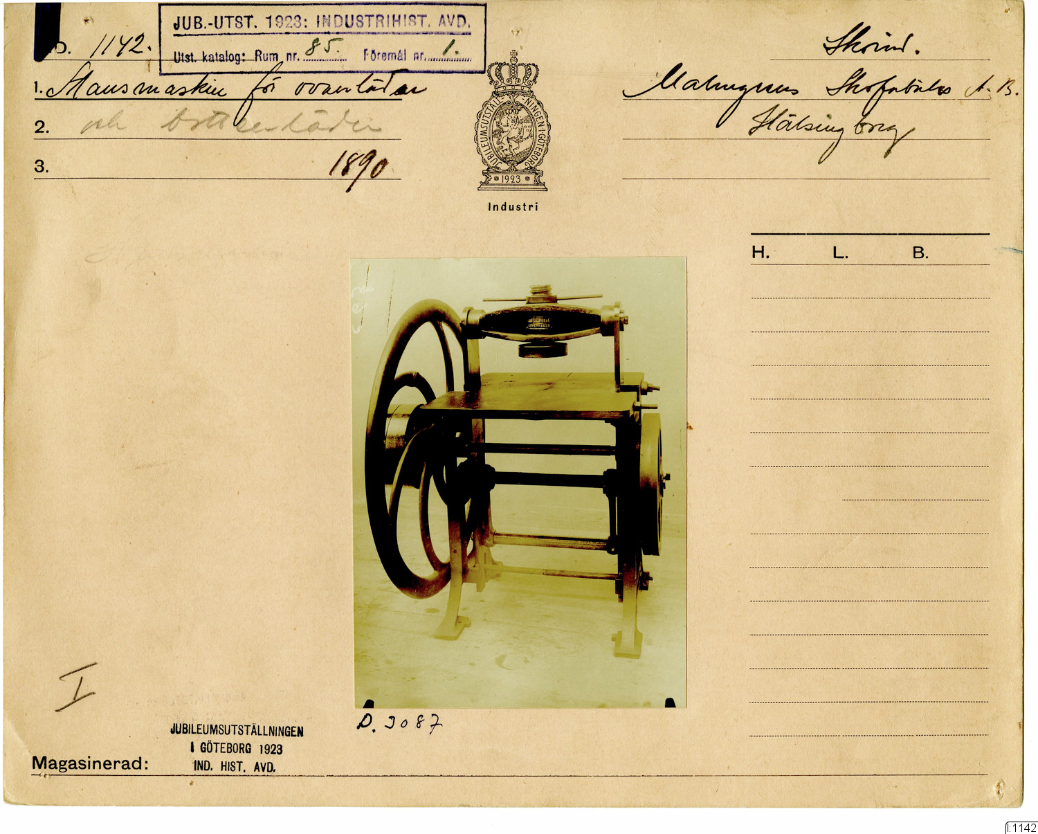 En stansmaskin för ovanläder och bottenläder. Tillverkad 1890. En lapp på objektet talar om att det kommer från Malmgrens Skofabriks-Aktiebolag, Helsingborg. Det finns också en oläslig text i blyerts som talar om vem objektet skulle till, samt F.v.b (för vidare befordran). Maskinen är tillverkad av Axel L Levin & Co, Copenhagen.