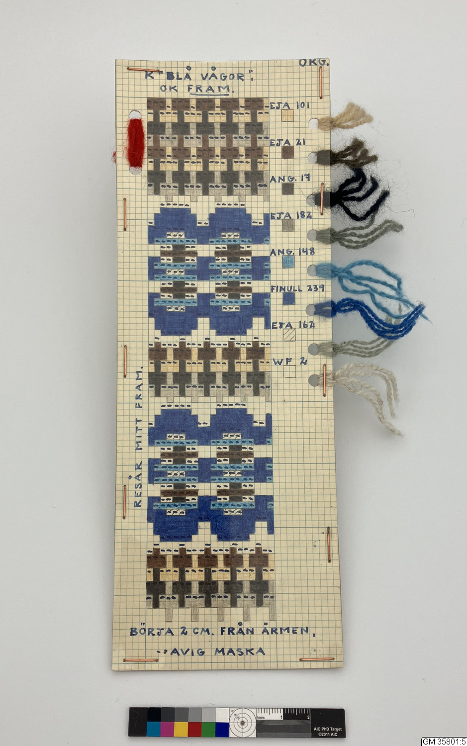 - Arbetsritning till stickmönster "Blå Vågor" i beige, grått, svart, två gröna och två blå nyanser på papper med färgprover i ullgarn.