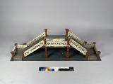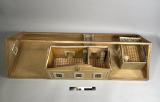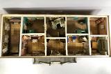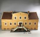 Modell av Söderlingska huset, "Oljekvarn", vid Djurgårdsgatan i Majorna. Fastigheten uppfördes 1823 och nedrevs i slutet på förra årtiondet (sic) då den fick vika för nyare bebyggelse. Förfärdigat av trä, papp och papper samt rumsindelning efter originalet. Med avtagbart tak.