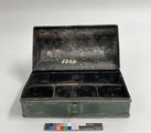 "Skrivschatull av järnbleck i form av ett skrin med lock, invändigt försett med fyra fack för penna, bläckhorn och sanddosa. Grönmålat. - I gesällskapets »RÄKENSKAPSBOK» finnes följande anteckning för år 1785: »En skrif Låda med dess tillbehör af Bläck - 16. En linial -. 4. En Penneknif -. 16.»