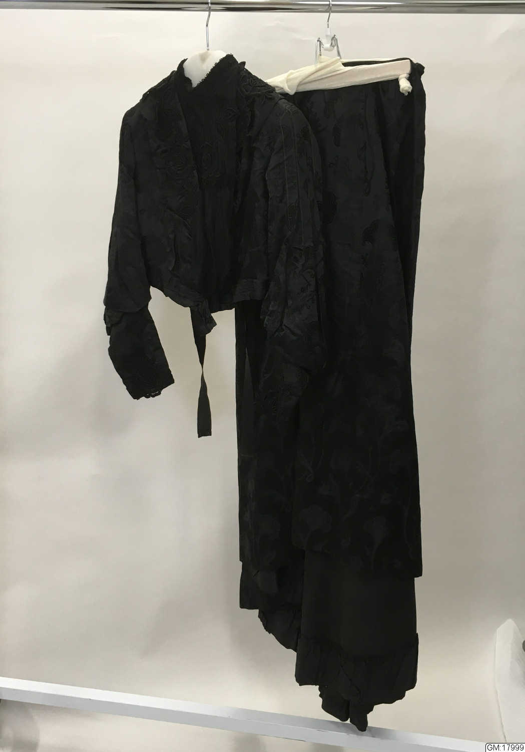 Klänning i svart mönstervävt siden bestående av liv och kjol.