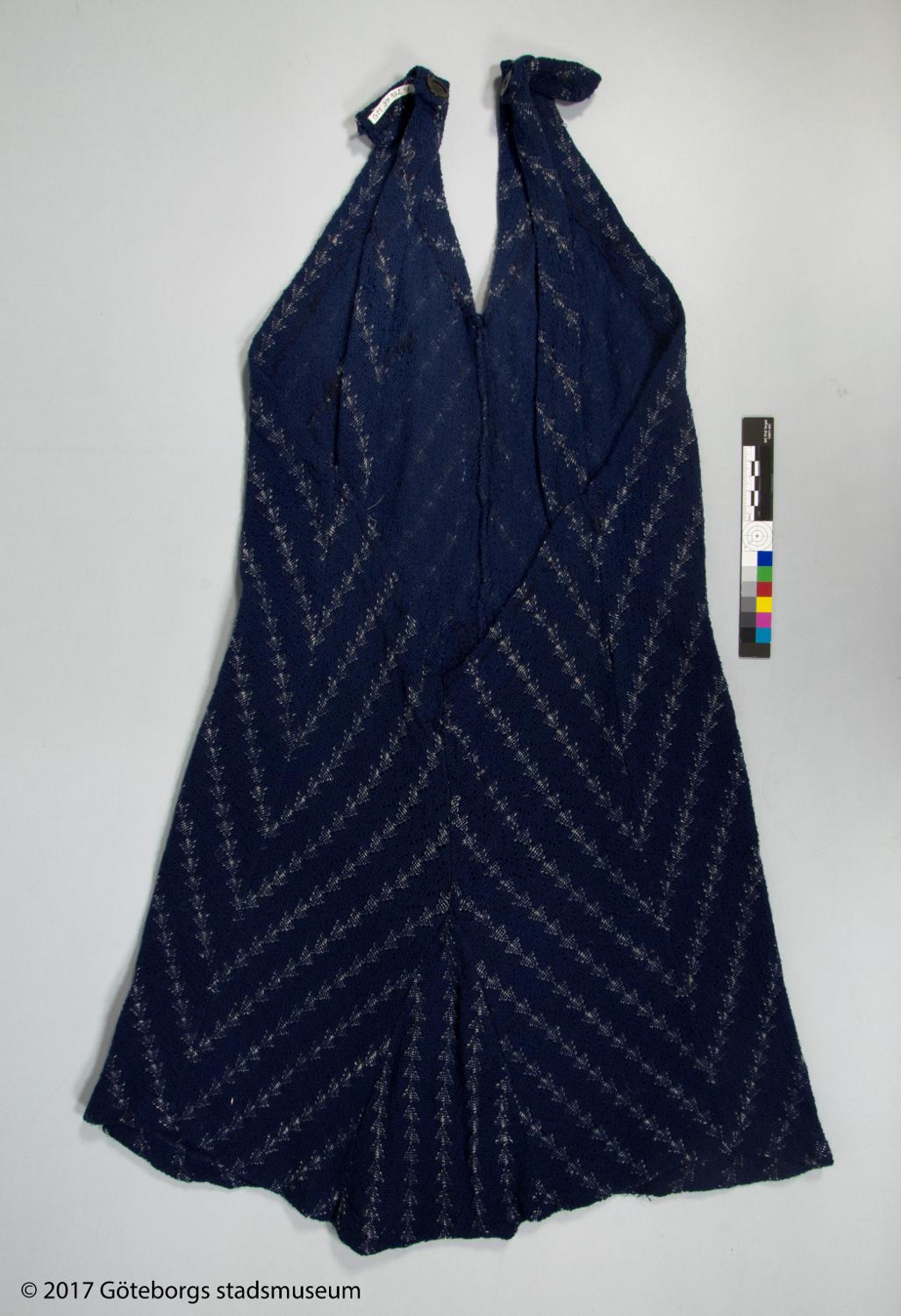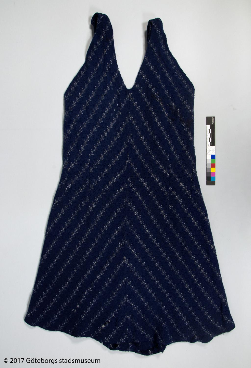 V-ringad baddräkt i blå yllejersey med vita randinslag. Modellen har söm mitt fram och mitt bak. Knappar i axelbanden som är korslagda i ryggen. Omsydd av en gammal tröja.