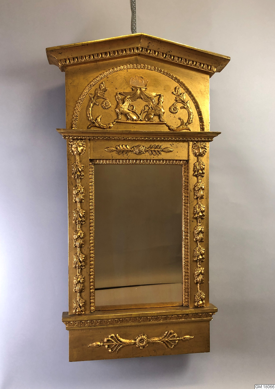 - Väggspegel, förgylld, signerad på baksidan med "MB" och med Göteborgs hallstämpel. 1800-talets början. Ovanför glaset sitter två sfinxer under en halvbåge och håller upp en krona (denna saknas), flankerade av blomgirlanger. På båda långsidorna; frukt- och blombårder krönt av ett lejonhuvud. Det finns även äggstav- och pärlstavsbård.