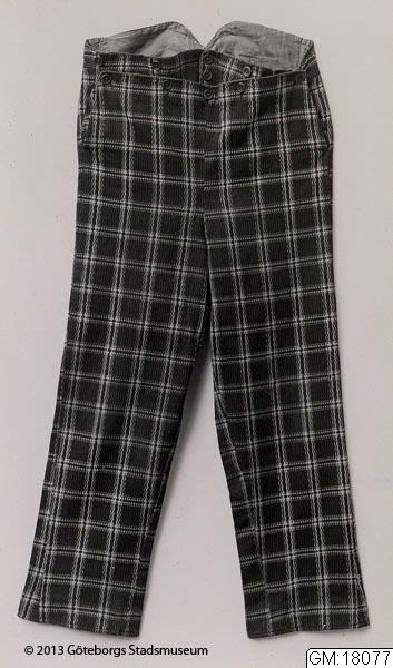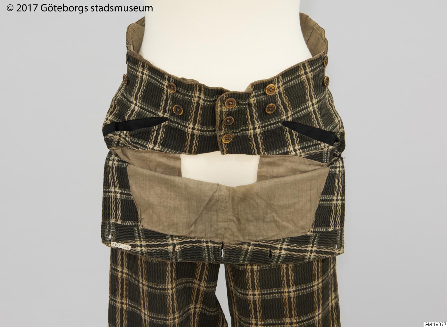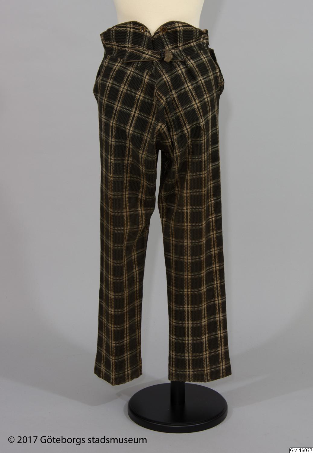 Byxa, troligen från sent 1850 tal eller tidigt 1860-tal av rutigt, relieffvävt tyg i olika bruna nyanser. Byxorna är av rak modell och har en lucka framtill som knäppes med knappar i varje sida. Mitt bak finns en sölja för att justera midjevidden. Dessutom finns det knappar längs med linningen för hängslen.