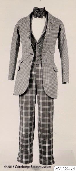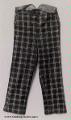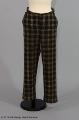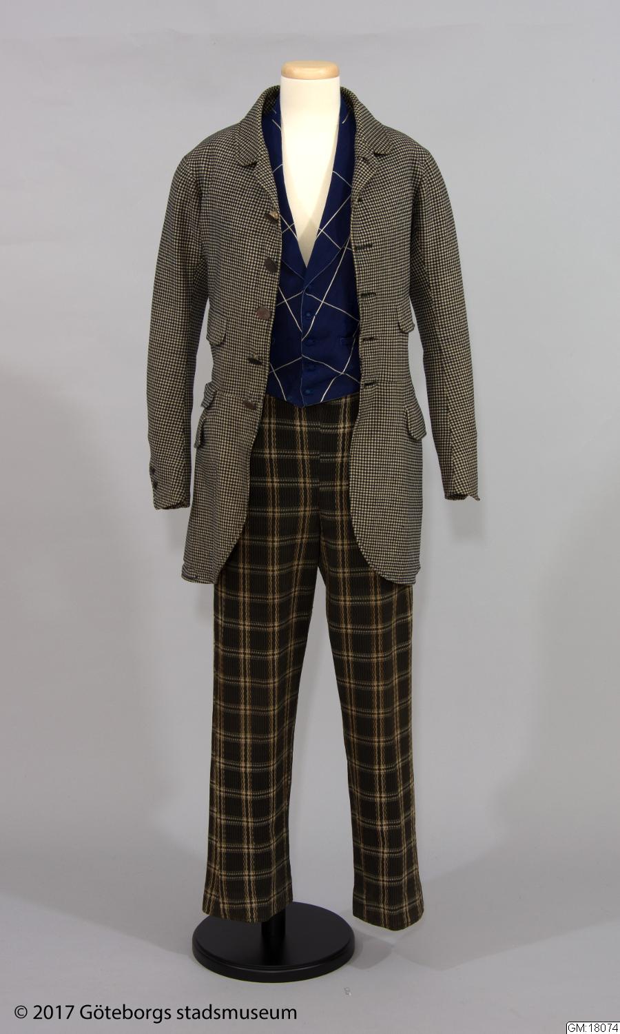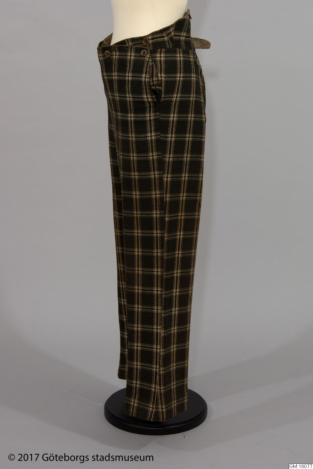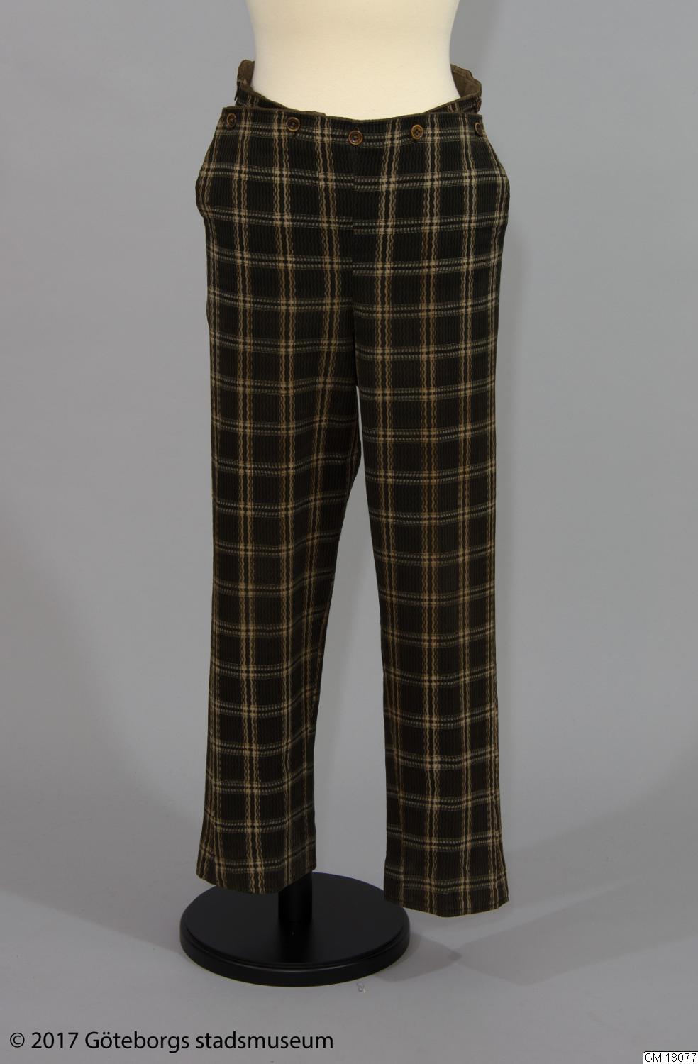 Byxa, troligen från sent 1850 tal eller tidigt 1860-tal av rutigt, relieffvävt tyg i olika bruna nyanser. Byxorna är av rak modell och har en lucka framtill som knäppes med knappar i varje sida. Mitt bak finns en sölja för att justera midjevidden. Dessutom finns det knappar längs med linningen för hängslen.