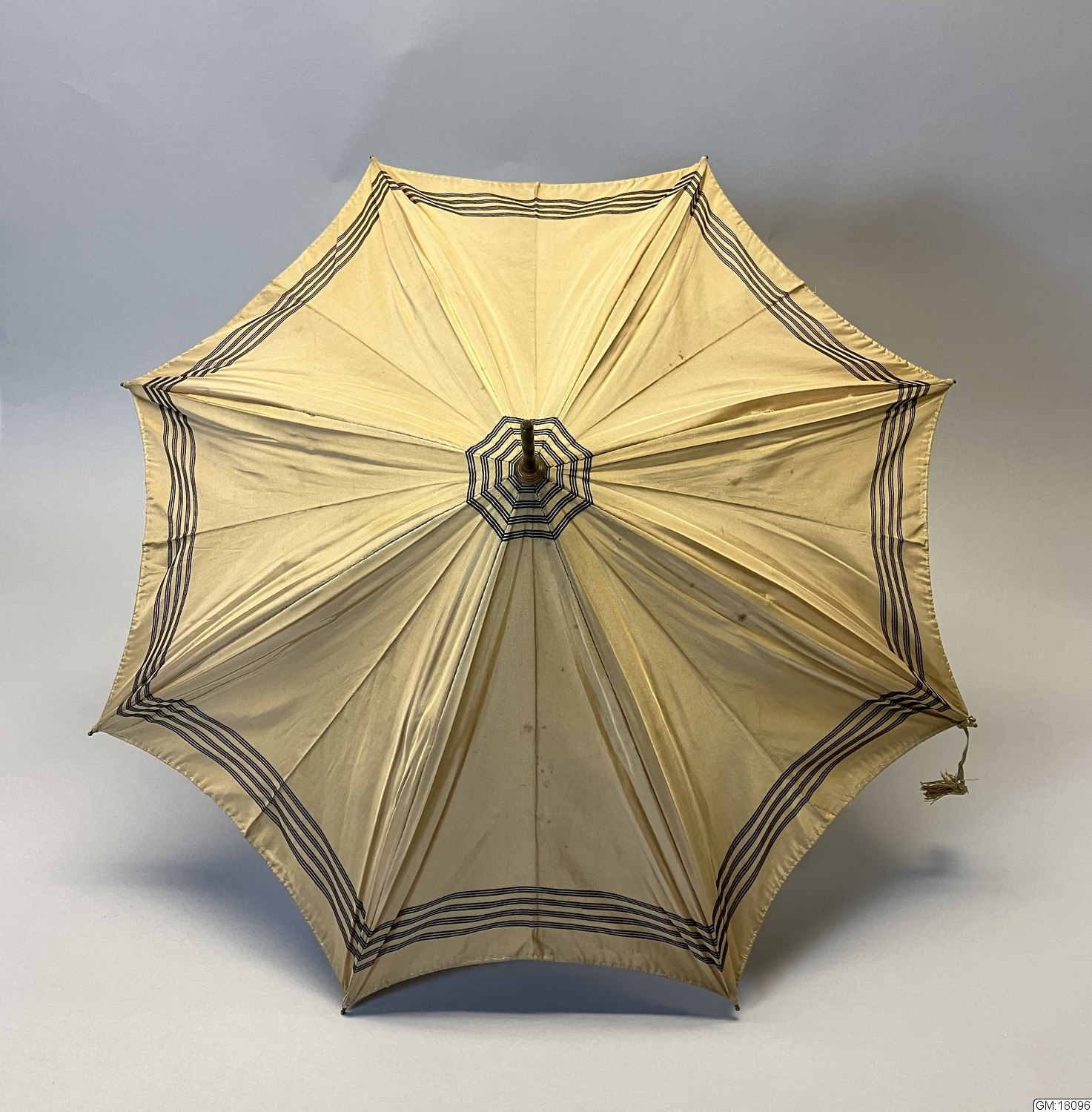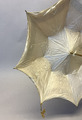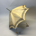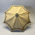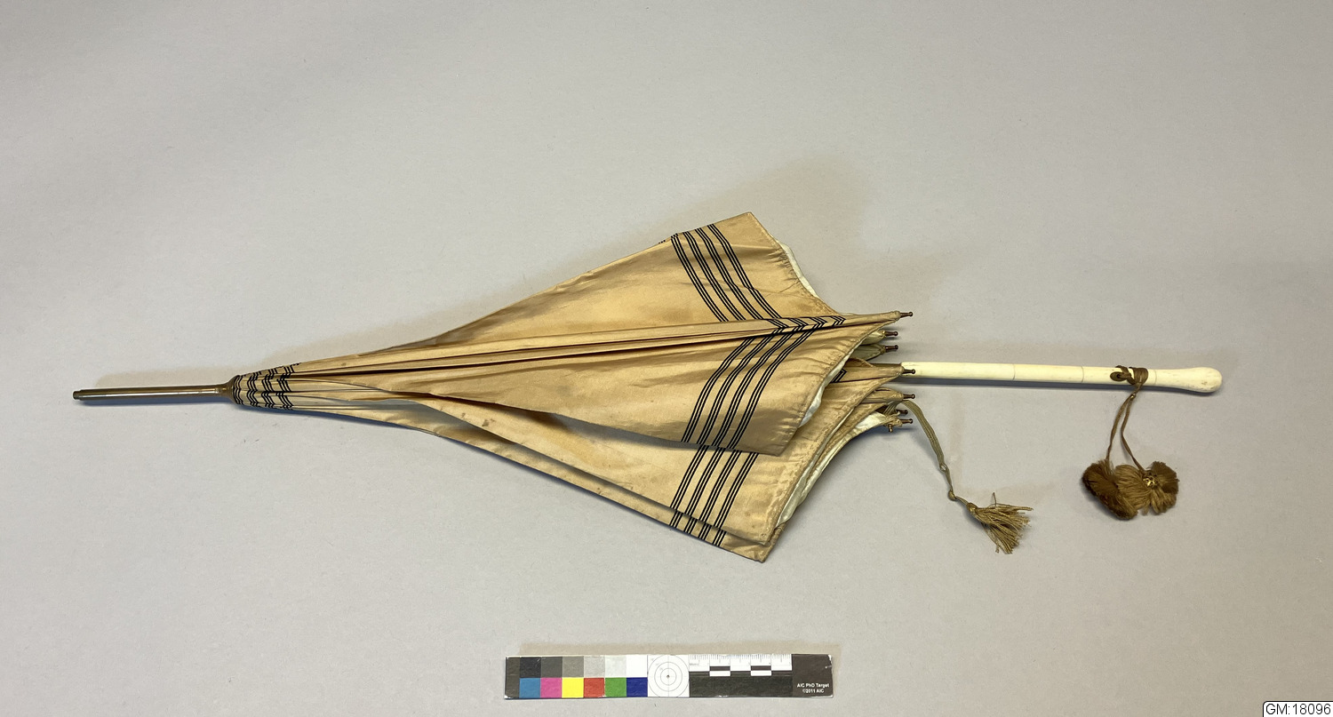 - Parasoll i ljusbrunt siden med svarta ränder längs ytterkanten och toppen. Stomme och topp i metall och handtag i ben. Insidan är fodrad med gräddvitt siden. Paraplyet har ett resårband för att hålla ihop det i nedfällt läge och handtaget har en vidhängande brun silkestofs.