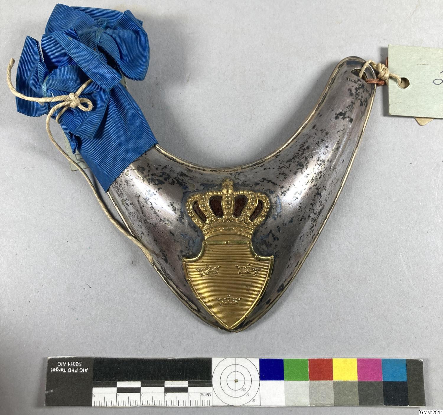 - tillverkad i Stockholm 1835, silverstämplar: stadstämpel, kattfot, årsstämpel samt mästarstämpel, brännförgylld mässing i lilla riksvapnet, läder på insidan med prickar markerande de vaktdygn den valthavande underofficeren avverkat./ctn