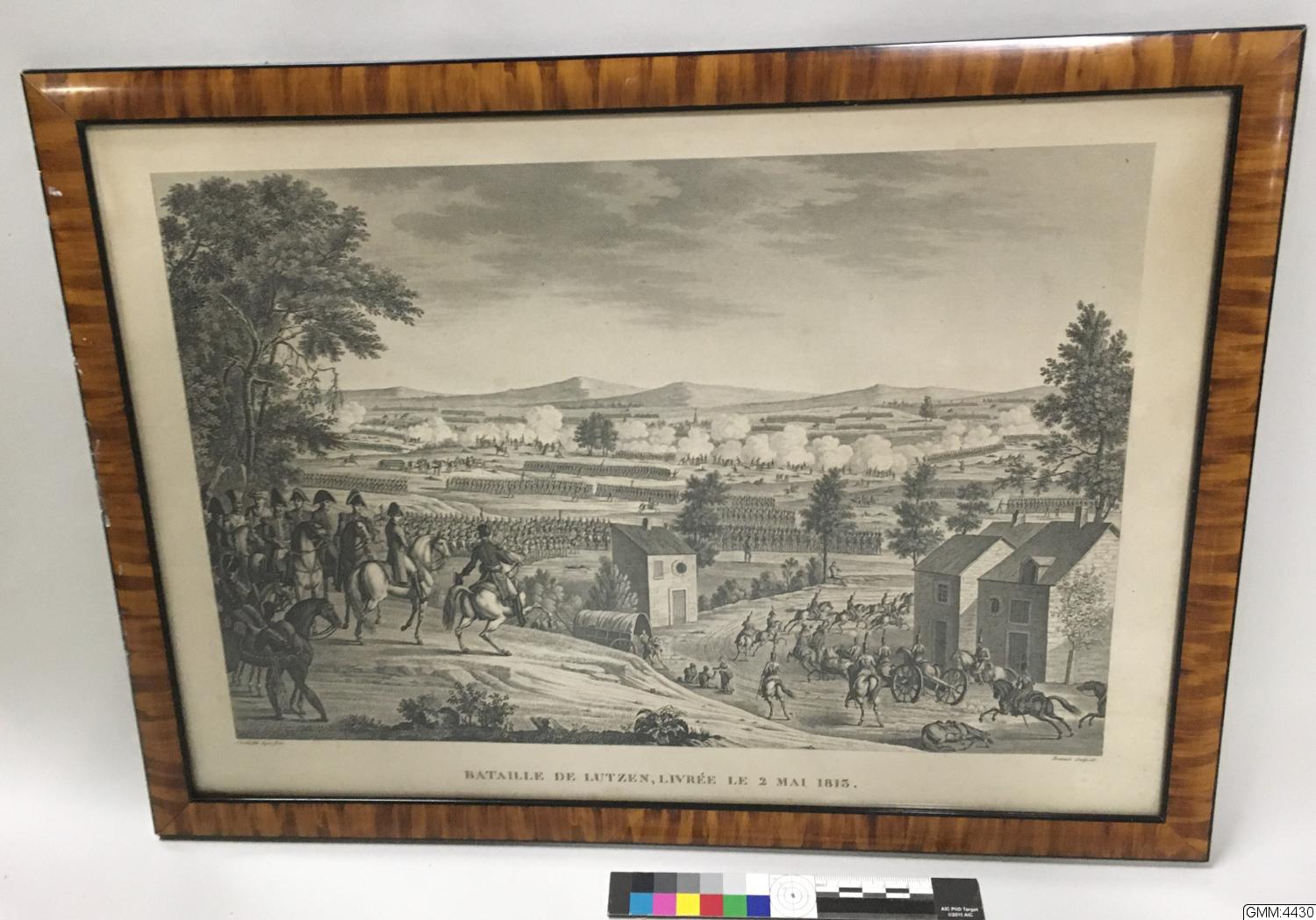Bataille de Lutzen, Livrée, le 2 Mai 1813. Bovinet Sculpsit. [graverat på framsidans nederkant.]; Påskrift på baksidan: "David Blidberg", hänvisar förmodligen till personen som tavlan förvärvats från. [blyertschant.]