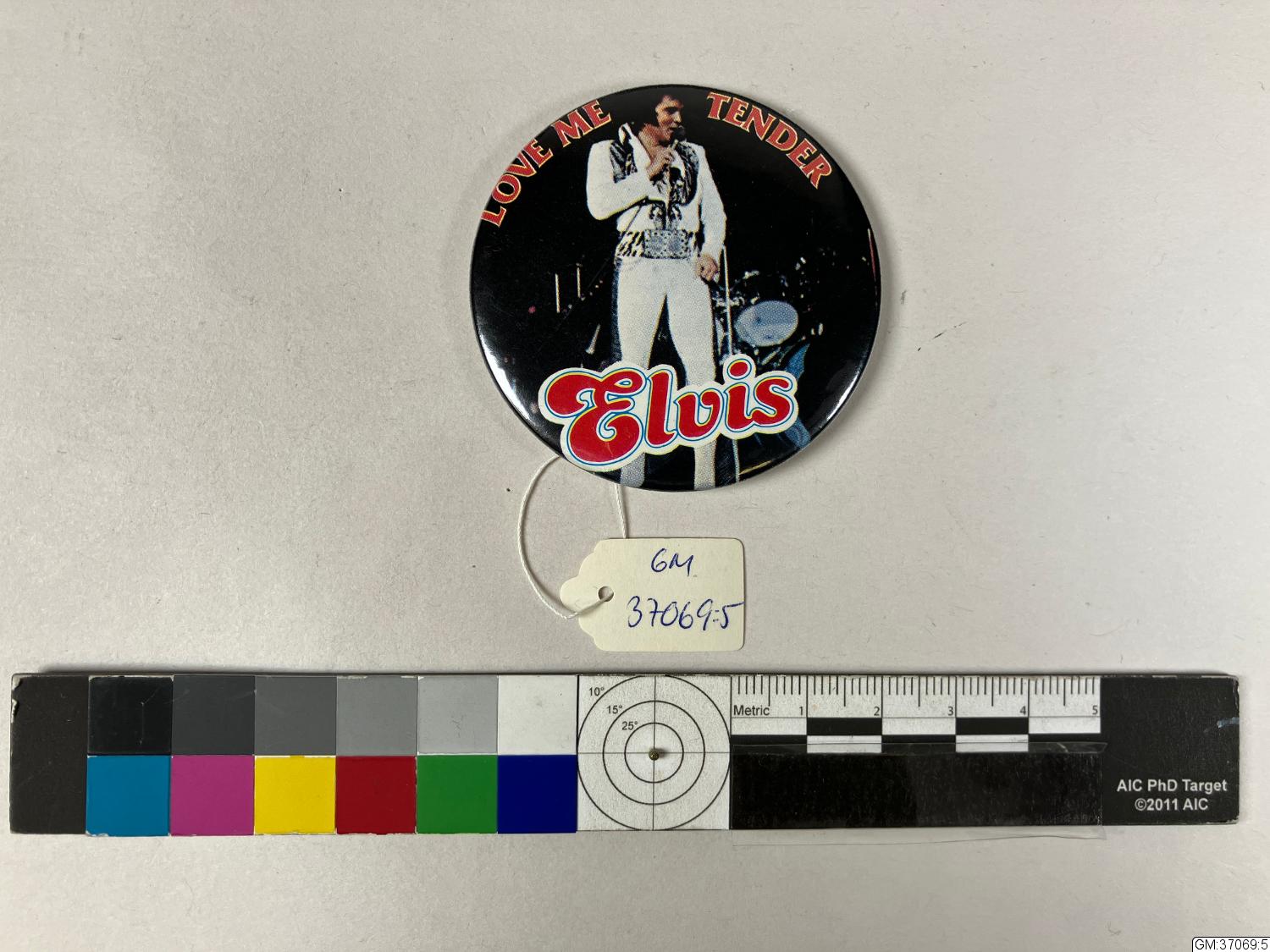 - En pin i metall och plast med "Elvis" och "Love me tender".