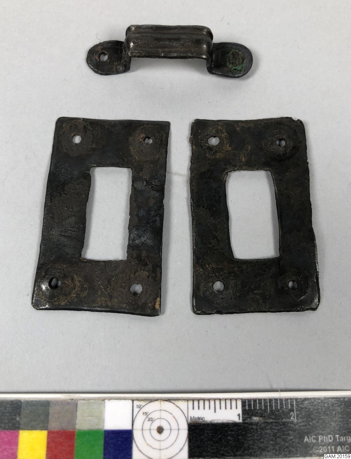 Beslag av silver fyrkantigt utskuret i mitten 4 nagelhål i hörnen