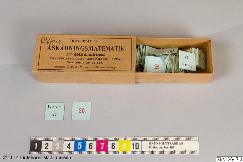 Läromedel för matematik, "Material till åskådningsmatematik" av Anna Kruse. Ask innehållande 100 lappar med tal på.