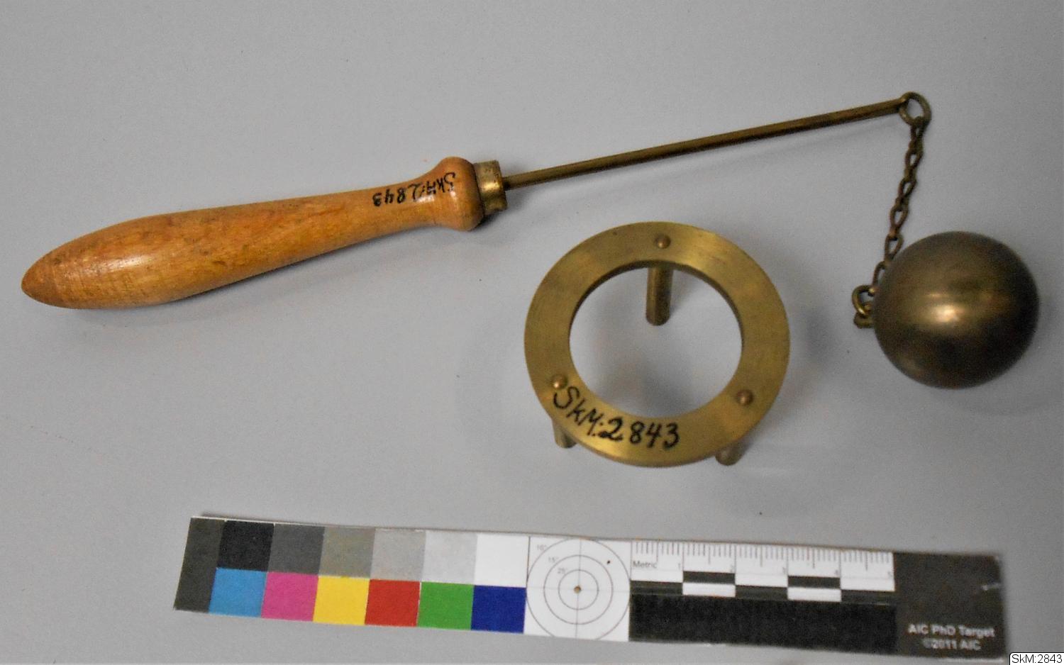 - Stativ med hål samt kula fastsatt i handtag medelst kedja.