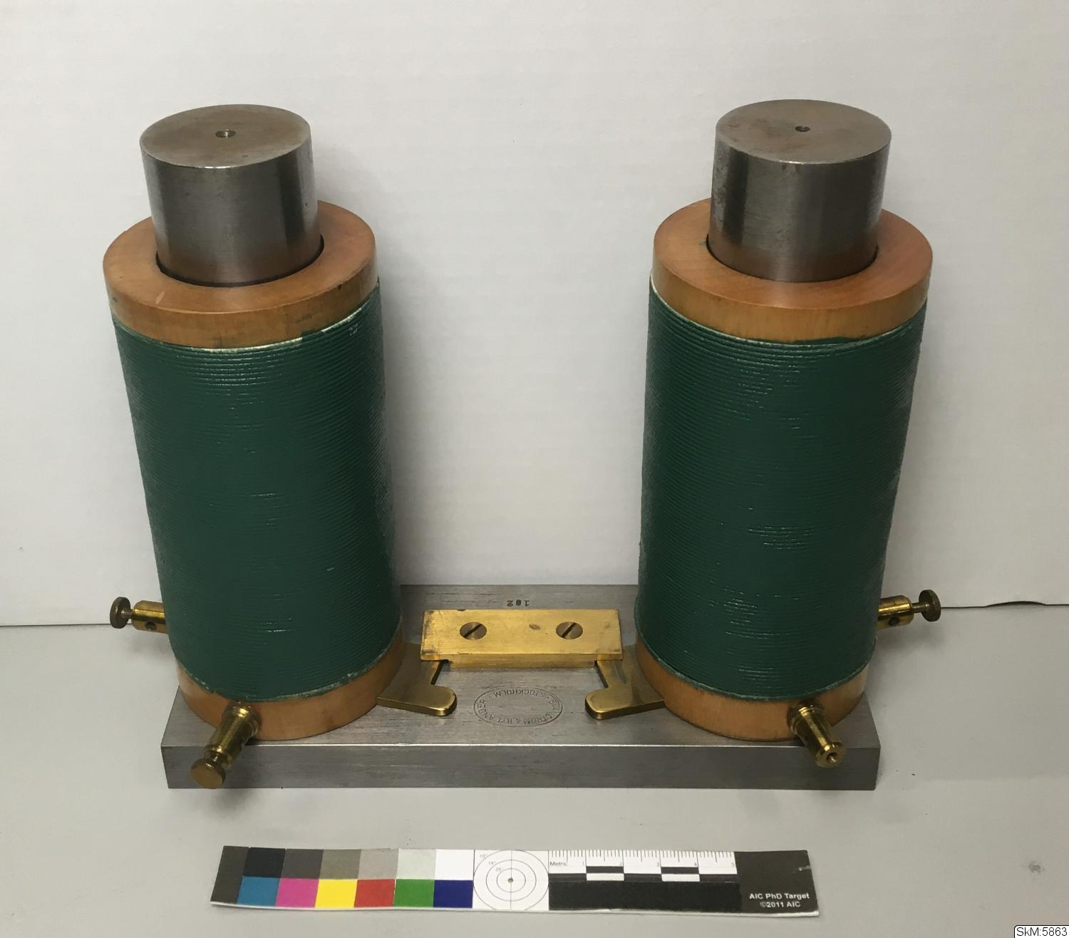- Metallplatta med två spolar av trä och lindad metalltråd. Märkt Svanström & Rylander Stockholm. "Lemoines elektromagnet" enligt assocciationskatalog. Spolarna var registrerade som 2864:a och 2864:b i accessionskatalogen.