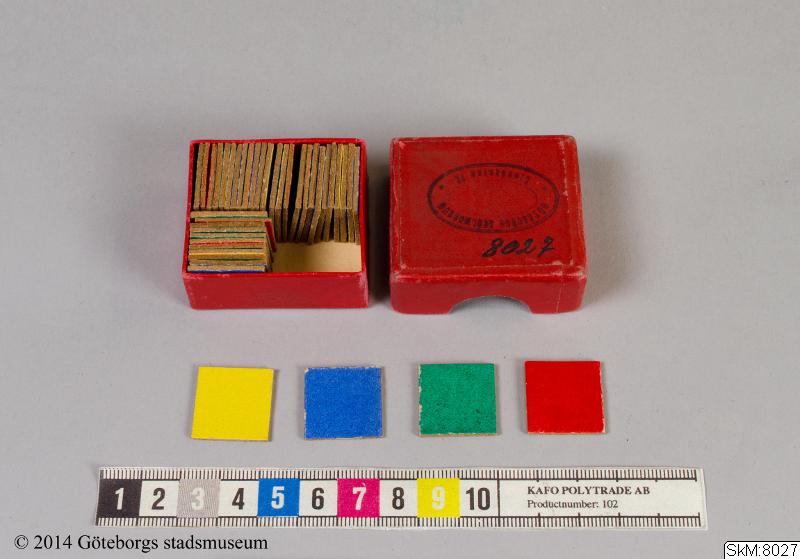 Räkneask (?) innehållande 40 st tvåfärgade brickor.