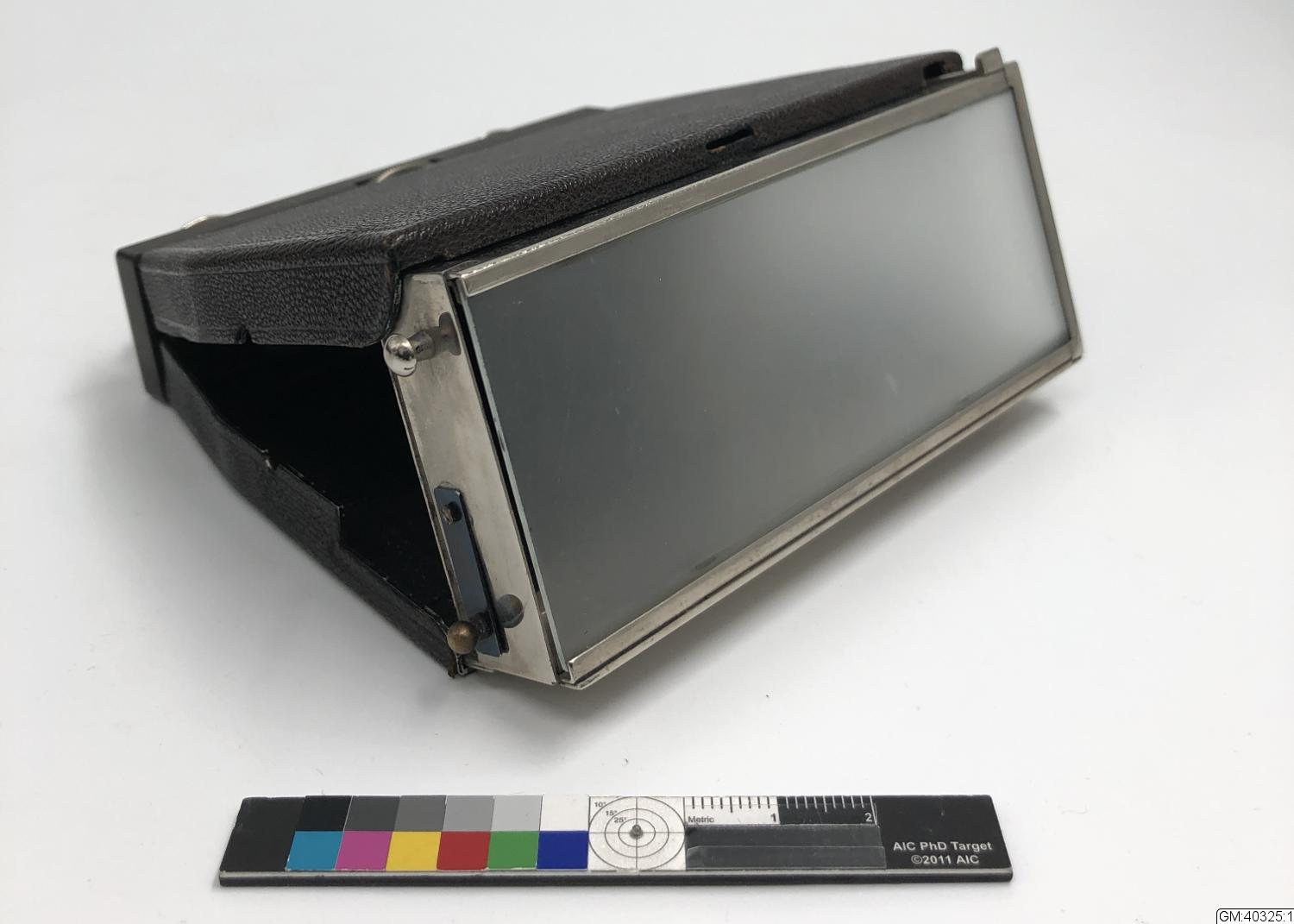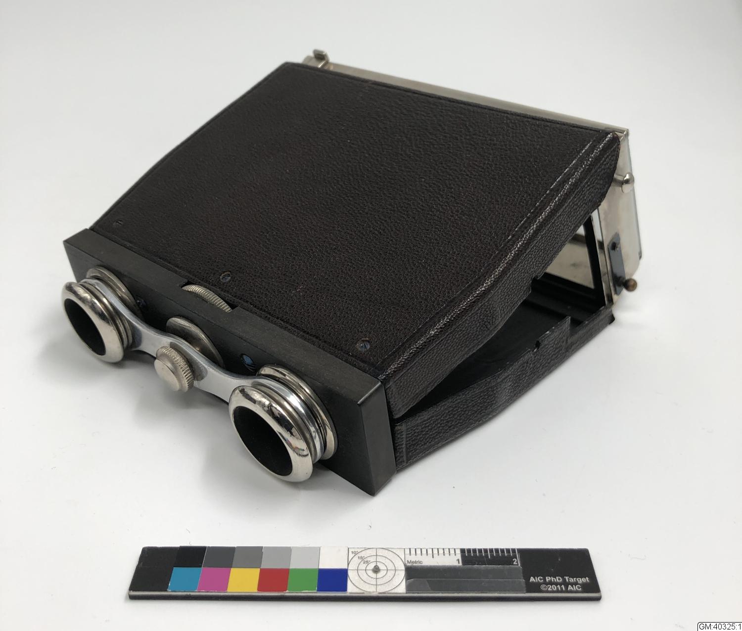 1) Kikarliknande, uppfällbart och reglerbart stereoskop av glas och plåt, delvis överklädd med svart saffian. För negativ till stereofoton eller positiva dylika på film monterade på glas ?