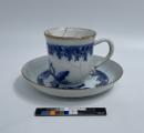 Kaffekopp med hänkel och fat av ostindiskt porslin. Dekor i sepia blanco och blå underglasyrfärg med motiv av släkten Grills vapen