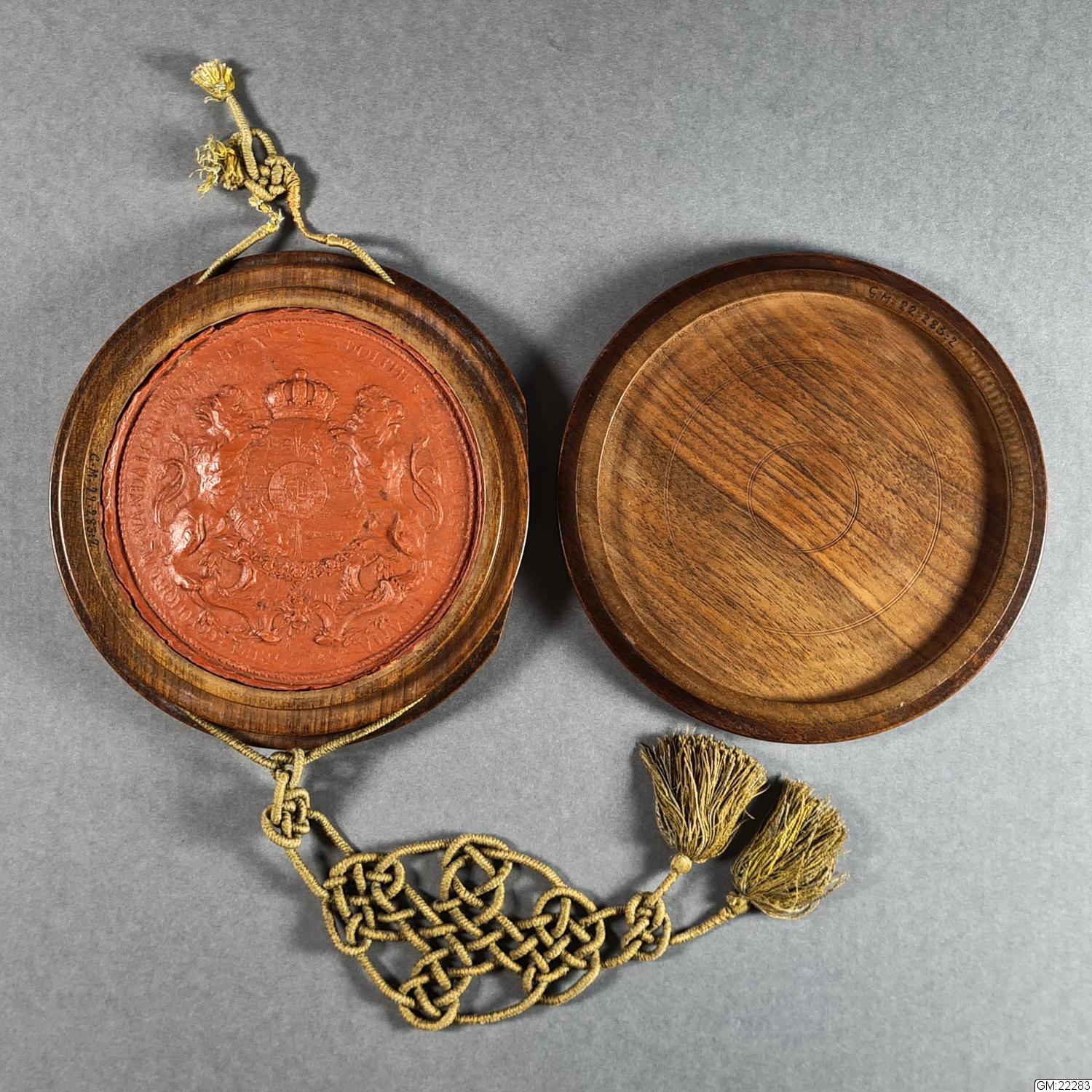 Sigill till adelsbrev; vapenbrev utfärdat 1707, underskrivet av Karl XII, för Justus Ludwig von Olthoff.