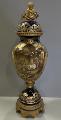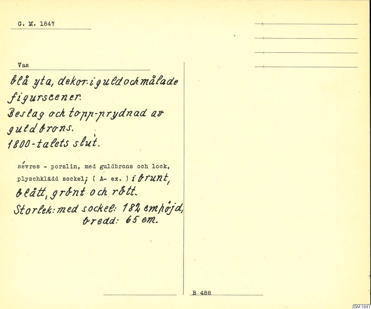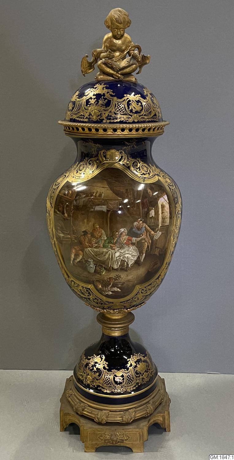 - Stor vas av porslin med lösa beslag av metall med tillhörande plyschklädda pedistaler. Del av ett par med GM:1846.