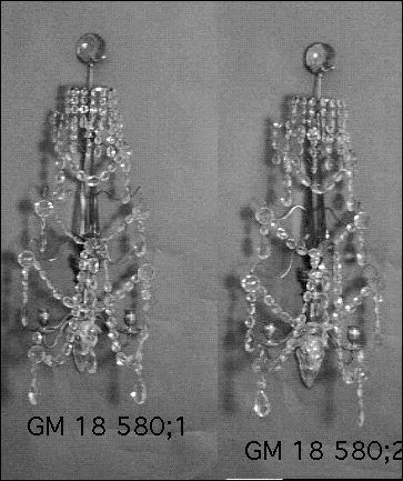 Material: glas metall. Teknik: gjutet slipat. Ett par lystrar av förgylld brons med prismor. Nedtill ett vädurshuvud.