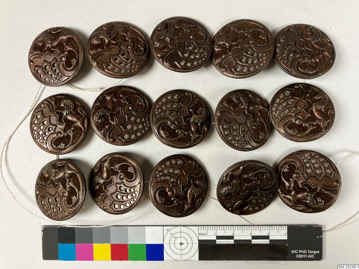 1 av 15 likadana knappar kopparfärgad genombruten metall där textil syns i hålrummen