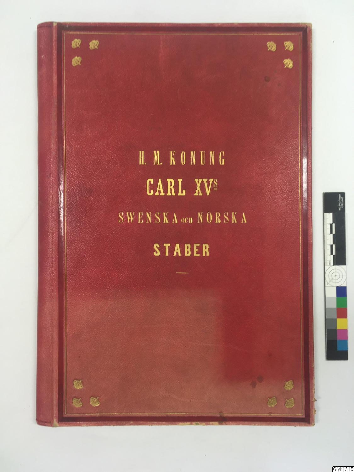 Stamrulla över H.M. Konungen Carl XVs svenska och norska staber. Inbunden i rött skinn.