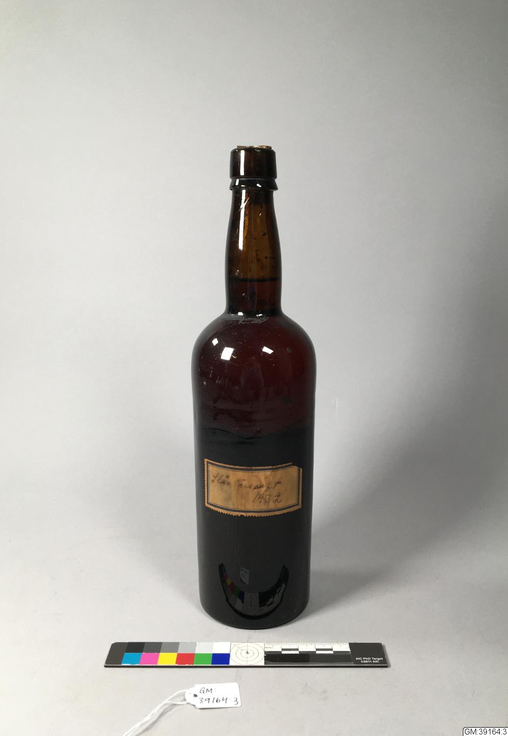 glasflaska innehållande slånbärssaft, daterad på etikett till 1932