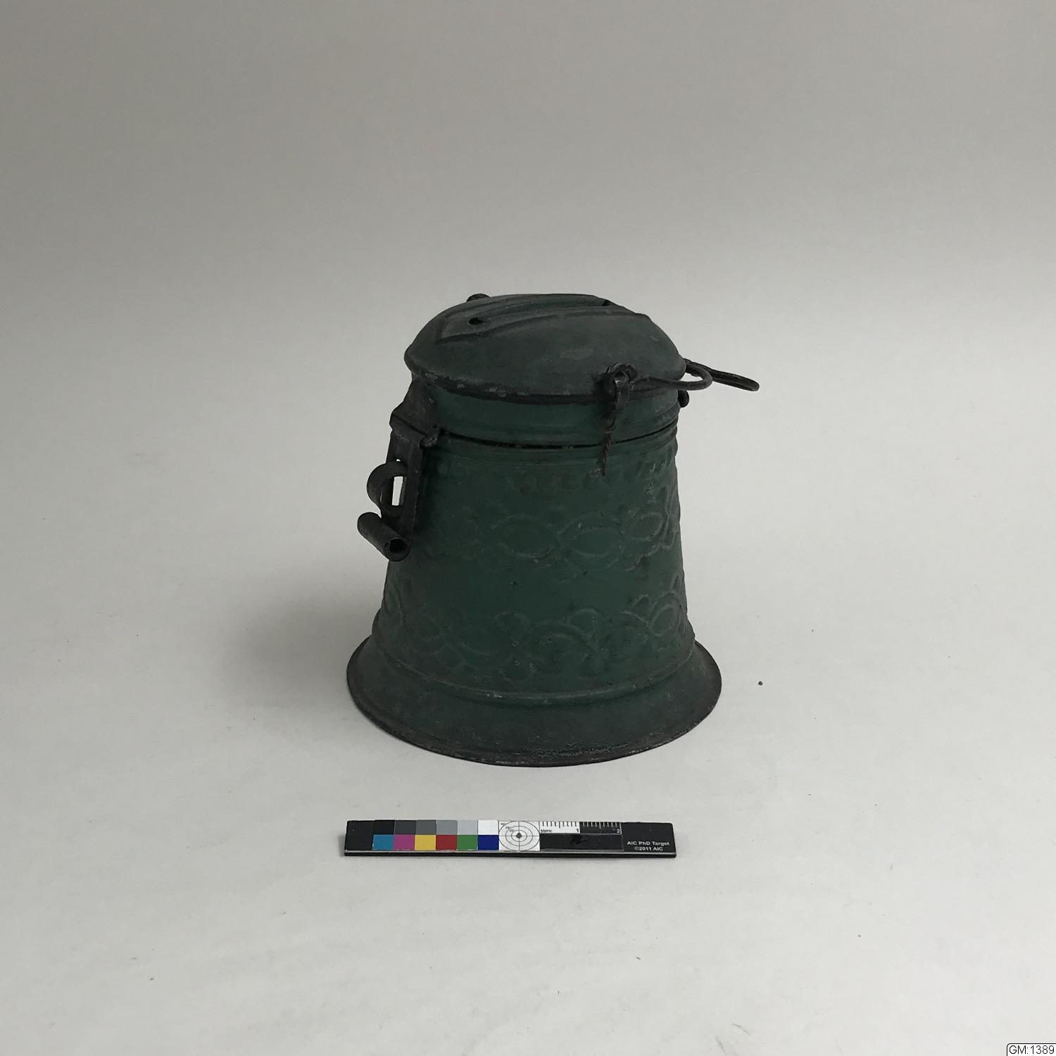 "Sparbössa av järnbleck med drivna ornament, utvändigt oljemålad i grönt och svart, invändigt i rött. Lock med skåra.