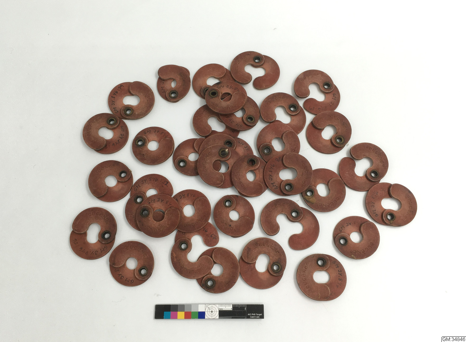 :50-83) 34 st röda tvådelade halvcirkelformade plattor av hårt gummi. Märkta Eugénie