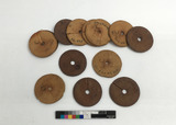 :50-83) 34 st röda tvådelade halvcirkelformade plattor av hårt gummi. Märkta Eugénie