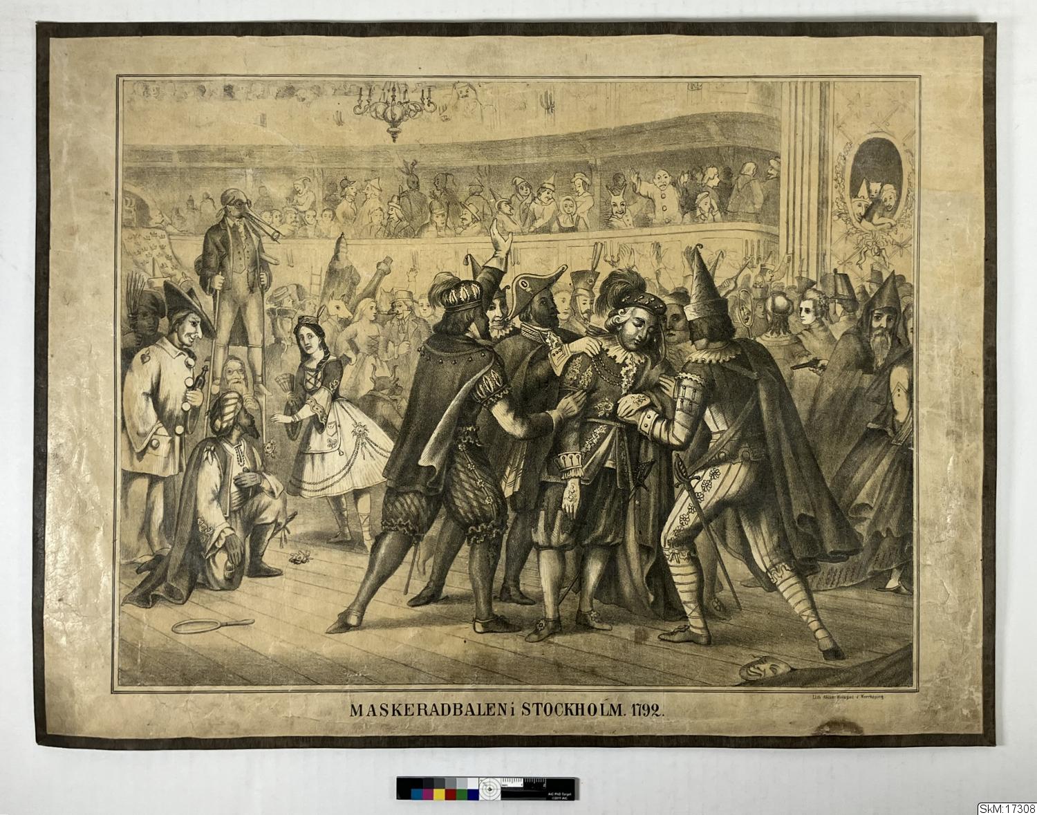 Skolplansch ur serien Svenska historien i bilder, föreställande mordet på Maskeradbalen 1792