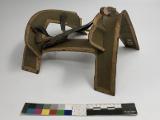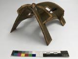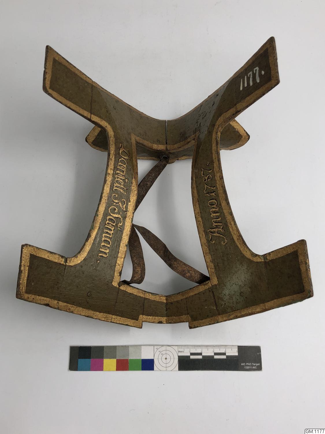 Sadelmodell i grönmålat trä, med remmar för upphängning. Med inskrift "Daniell I. Säman Anno 1787".