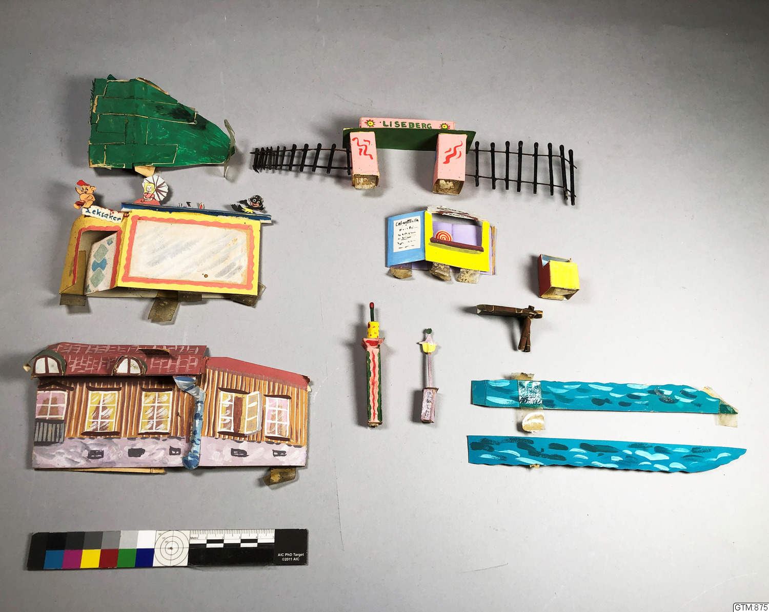 En samling scendetaljer som föreställer bland annat miljöer från Liseberg.