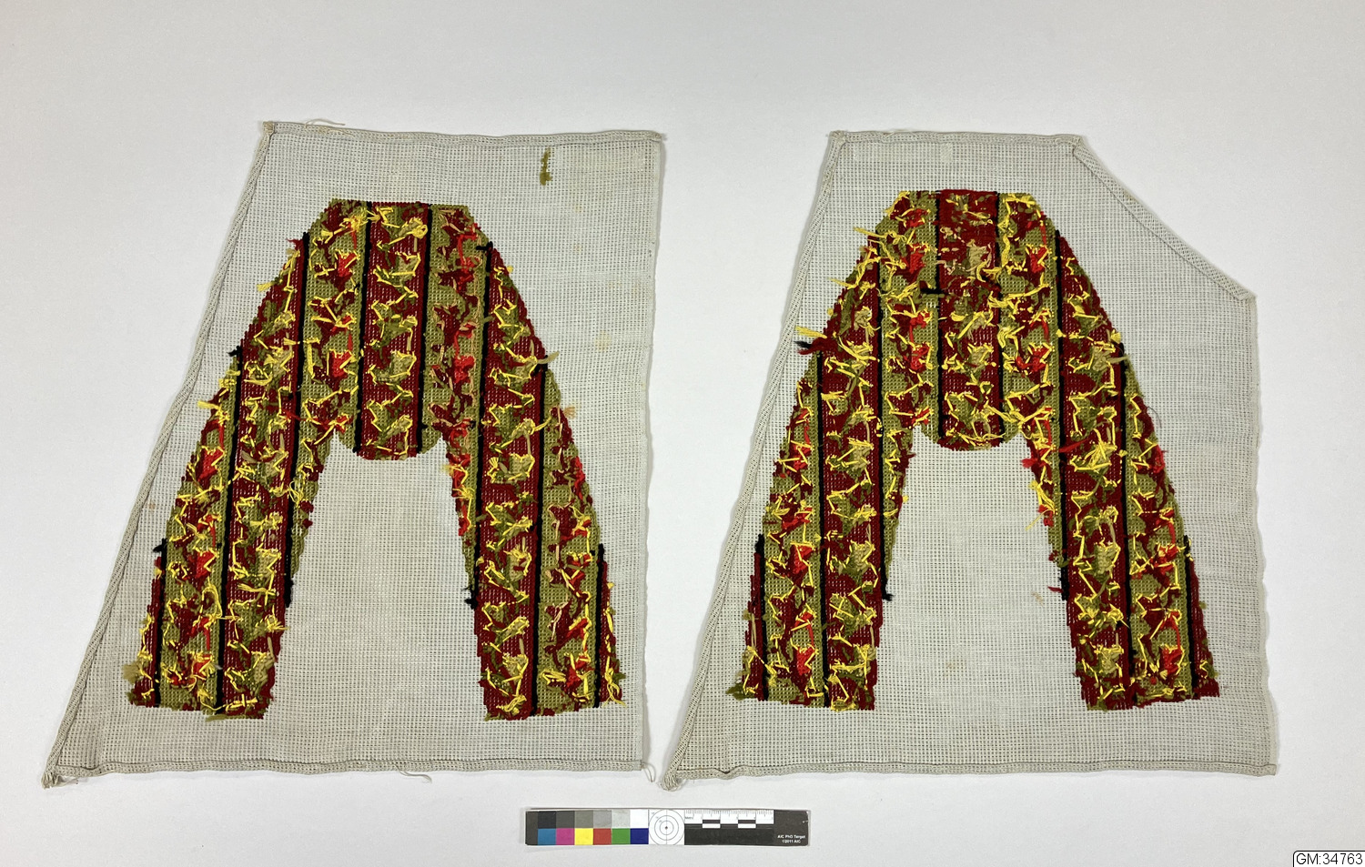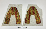 Två bitar stramalj med broderi med oilkfärgat ullgarn i randigt mönster avsedda att sy ett par manstofflor av.
