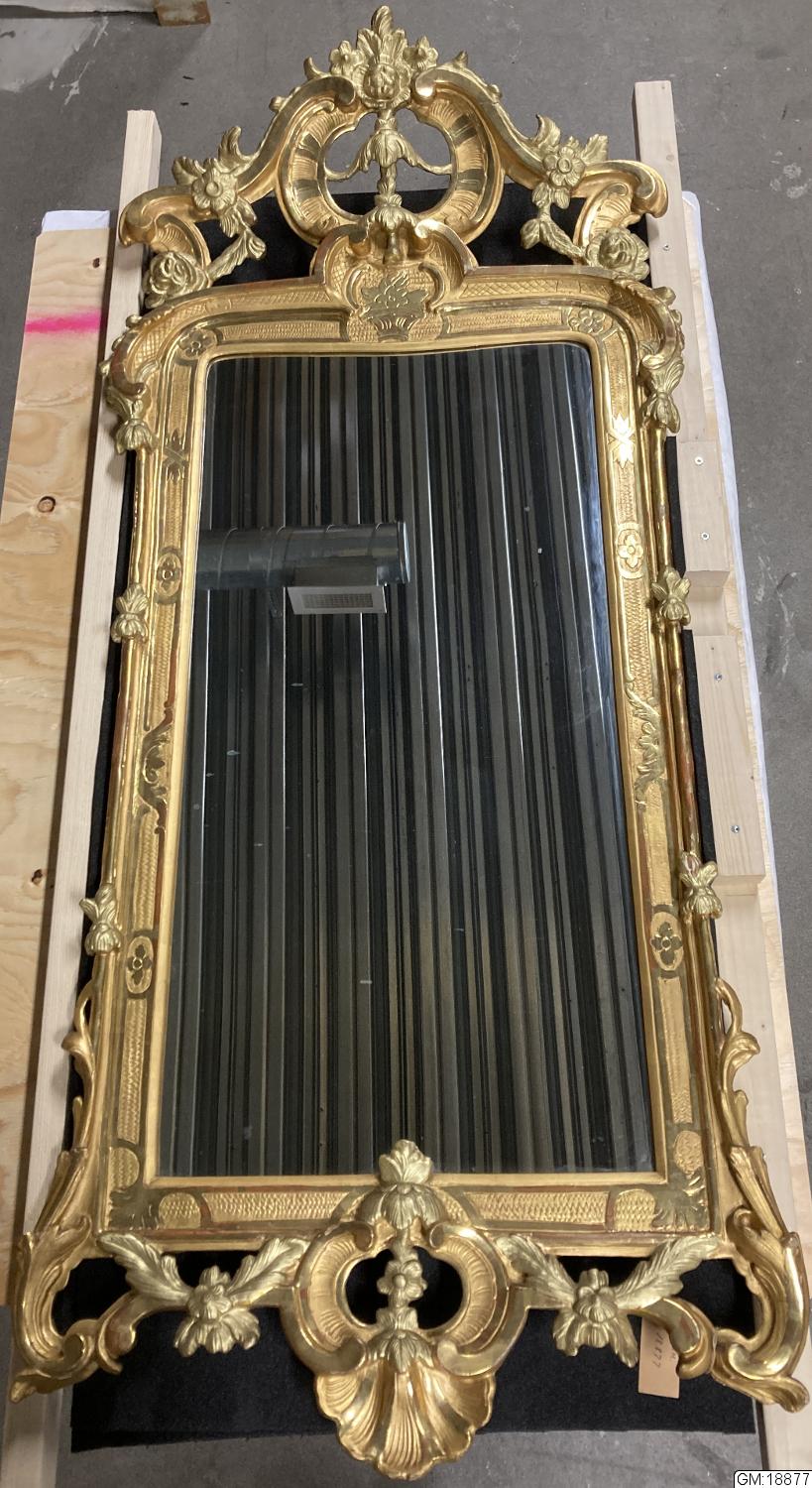 spegel, skulpterad,förgylld, rokoko, med nytt glas, delvis omförgylld med bladguld. Nytt glas. Otydlig hallstämpel på spegelns bakstycke./ctn