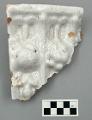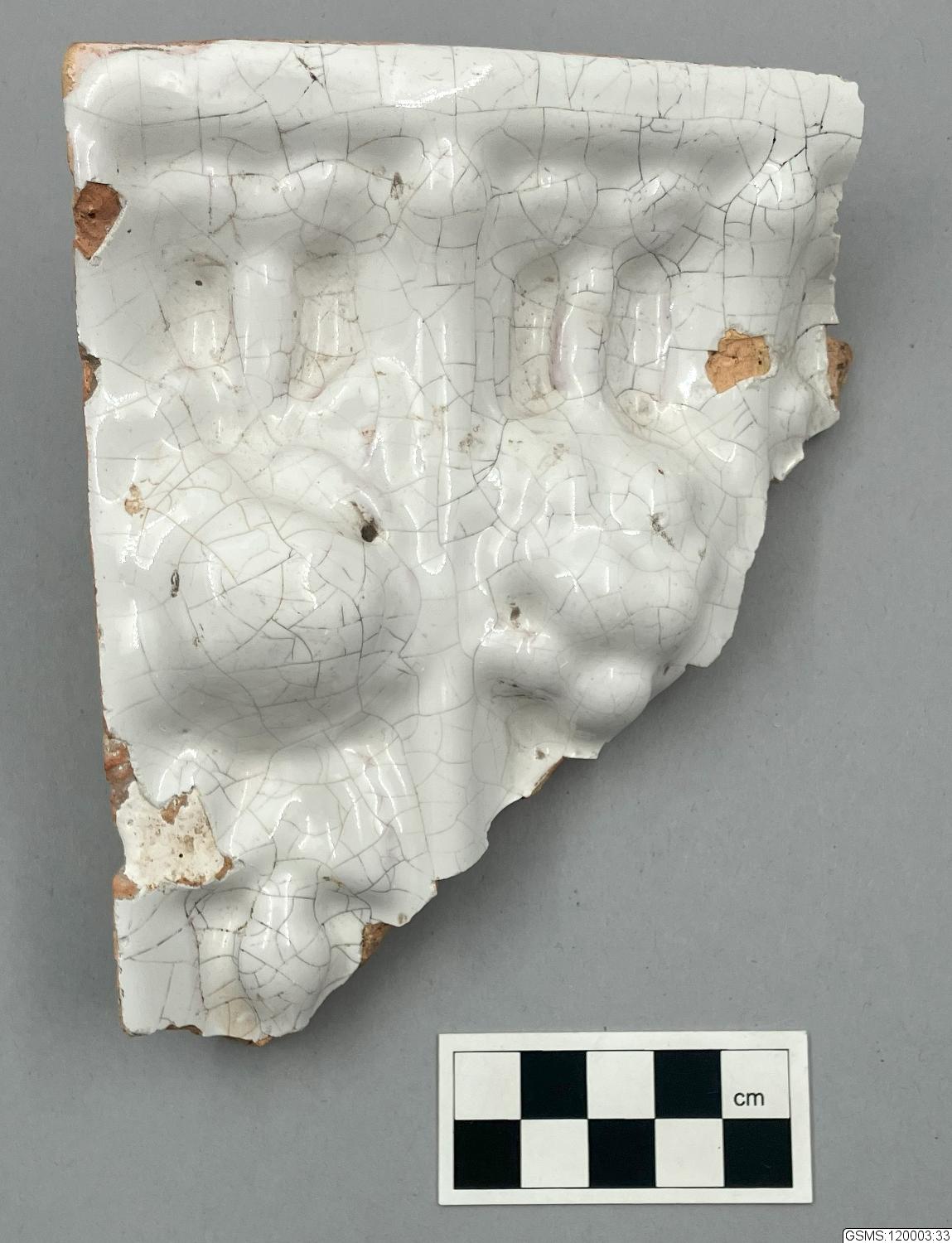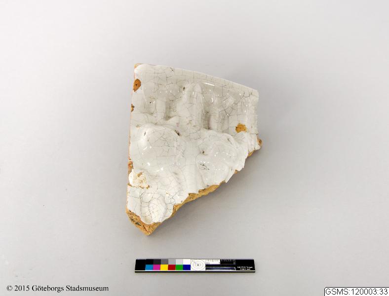 Fragment av kakelugnskakel med vit tennglasyr.