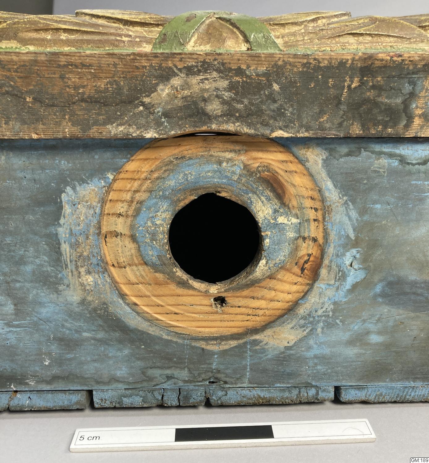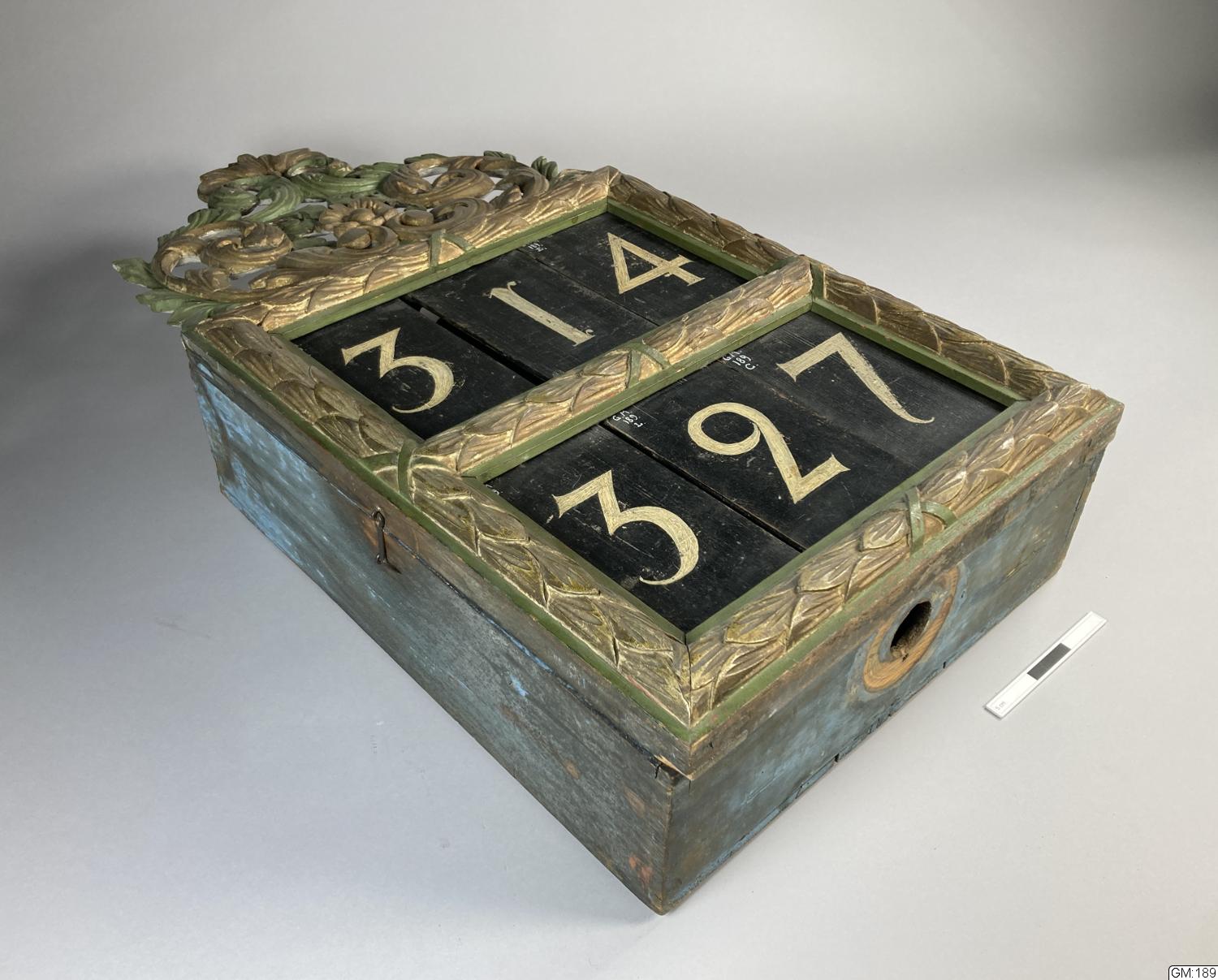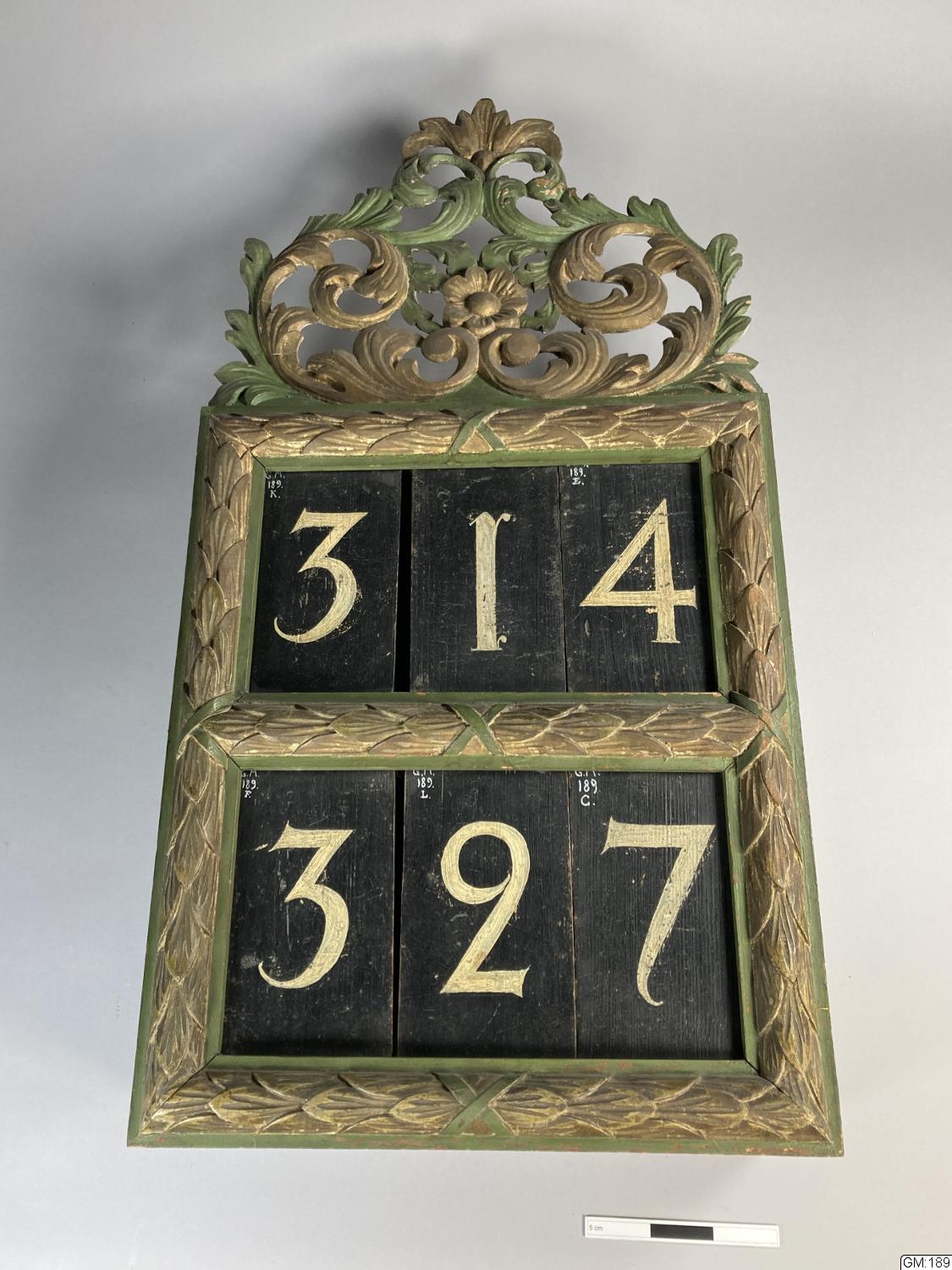 Skulpterad psalmnummertavla, krönet genombrutet. Bemålad i grönt och blått med spår av förgyllning. Förvaring bakom lucka med hasp.