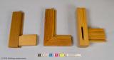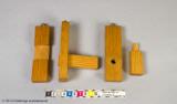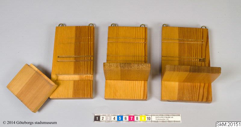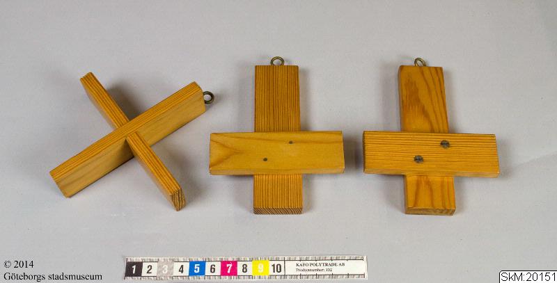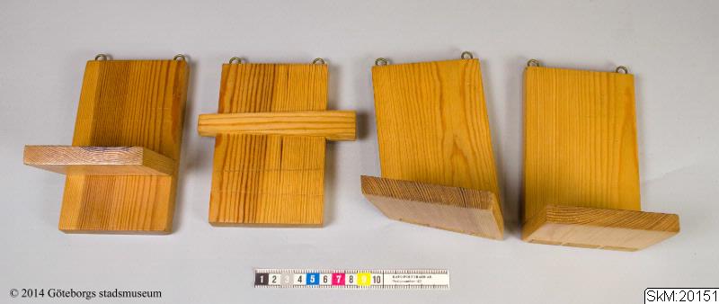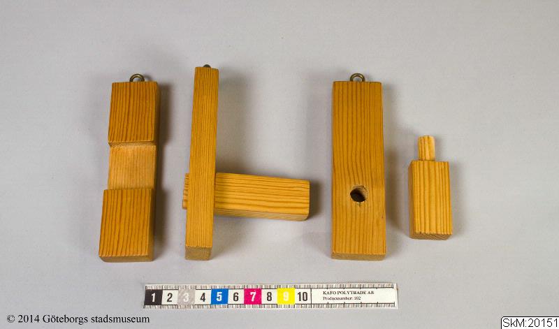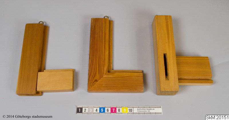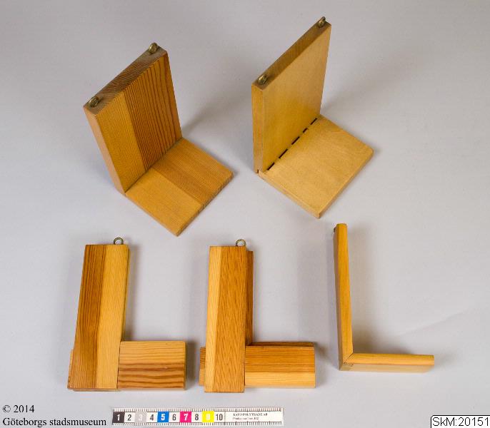 - 22 stycken vinklar av olika slag, troligtvis undervisningsmaterial för hopfogning av trä enligt lappen som medföljde lådan där de var nedpackade. Alla delar är av trä, förutom en ögla för upphängning som är av metall.